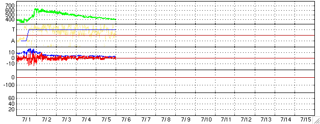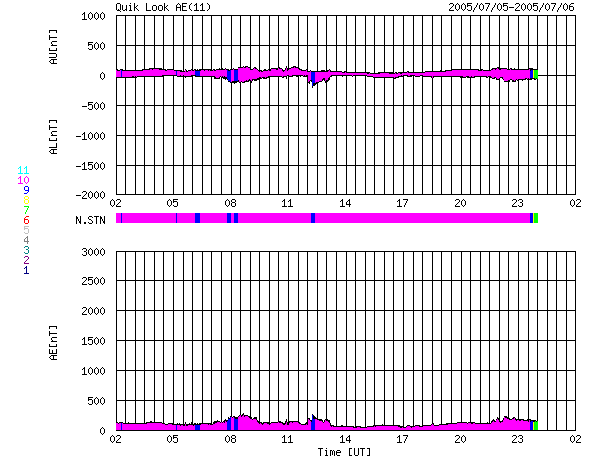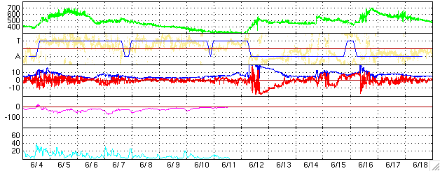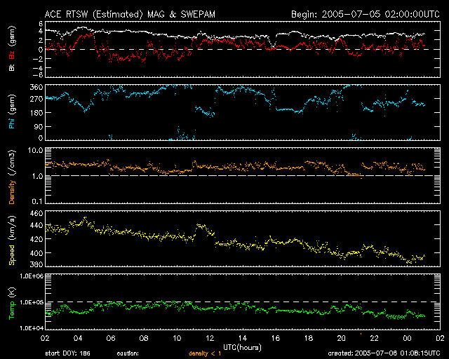 GOES衛星の太陽X線データ (c) NOAA/SEC ![]() SOHO衛星のMDIカメラによる太陽黒点 (c) SOHO (ESA & NASA) ![]() ACEが観測した太陽風の磁場(1番上の枠、白線は全体の強度、赤線は南北成分) および、太陽風の密度(3番目の橙線)、速度(4番目の黄線) (c) NOAA/SEC ![]() リアルタイムAE指数 下段のAEグラフの値が高くなると、オーロラ活動が活発化しています。 (c) 京都大学, NICT ![]() 27日の太陽周期に合わせたデータプロット (太陽風版) 太陽が同じ面を地球に向けていた27日前の変化から、今後を予想することができます。 (c) NICT