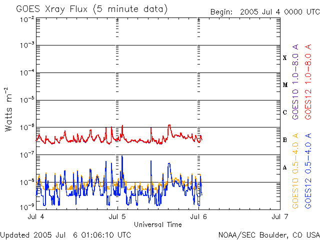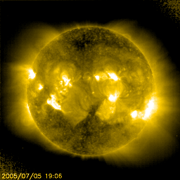 2005/ 7/ 6 10:13 更新 C1の小規模フレアによりCMEが発生しています。黒点群が9個に増えました。太陽風、磁気圏は静穏です。 担当 篠原 6日0時(世界時5日15時)に、788黒点群でC1の小規模フレアが発生しました。 フレアとしては小さなものですが、CME(太陽ガスの放出現象)を起こしています。 SOHO衛星のLASCO C3カメラによって、ガスが噴出する様子が捉えられています。 発生源がやや東(左)に寄っているため、地球は飛び出したガスの直撃を受けるわけではなく、 端の部分が当たることになるでしょう。 どの程度の変化が太陽風に発生するでしょうか。 乱れは、8日の昼頃地球にやってくると予想されます。 太陽風の乱れ方によって、オーロラ活動が活発化したり、 小規模の磁気嵐が発生する可能性があります。 また、これに先立って、5日10時(世界時5日1時)頃に、 太陽の中心やや南西(右下)の部分でフィラメント消失の様な変化が、SOHO EIT195で観測されています。 LASCO C3カメラでは、これに続いて南西に飛ぶCMEが見られています。 ただ、発生源が太陽の中心に近いわりに飛び出し方が片側に偏っているので、 このCMEは別の現象によるものかもしれません(SECは裏側の現象との見解を出しています)。 この現象に関連した太陽風の乱れが、7日の夜頃に地球にやってくるかもしれません。 太陽面は黒点群数が9個に達しています。 太陽活動としては最も静穏な時期に近づいているのですが(参考図)、 一時的には、この様に活発になることもあるのでしょう。 今のところ、目立った規模のフレアは起こしていません。 小さな活動はあちこちで発生しているようです。 太陽風は速度が400km/秒、磁場強度3nTで穏やかです。 磁気圏も穏やかな状態が続いており、AE指数のグラフにはほとんど変化が発生していません。 上記のCMEの影響があるまでは、このまま穏やかな状態が続くでしょう。 SOHO衛星のEIT284カメラの映像 (c) SOHO (ESA & NASA)