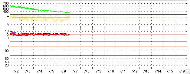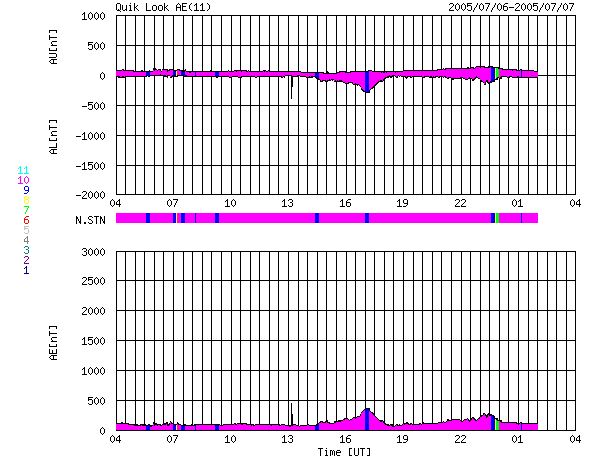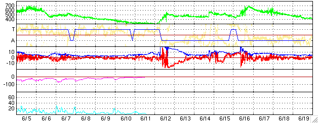 ACEが観測した太陽風の磁場(1番上の枠、白線は全体の強度、赤線は南北成分) および、太陽風の密度(3番目の橙線)、速度(4番目の黄線) (c) NOAA/SEC ![]() リアルタイムAE指数 下段のAEグラフの値が高くなると、オーロラ活動が活発化しています。 (c) 京都大学, NICT ![]() 27日の太陽周期に合わせたデータプロット (太陽風版) 太陽が同じ面を地球に向けていた27日前の変化から、今後を予想することができます。 (c) NICT