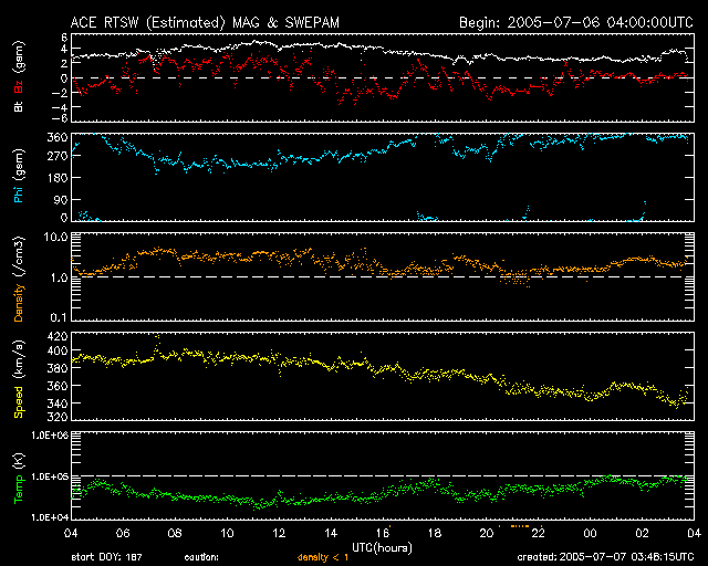 2005/ 7/ 7 12:54 更新 太陽風の速度は遅く、磁気圏も穏やかです。明日、CMEの影響で太陽風に乱れが発生する可能性があります。 担当 篠原 ACE衛星の観測によると、太陽風の速度は一段と低下して340km/秒になっています。 磁場強度も普通のレベルで、太陽風は穏やかな状態が続いています。 磁場の南北変化を見ると、振幅は小さいながらも南寄りを保っていた時間帯もありました。 ただ、速度が遅いので磁気圏への影響は小さく、AE指数には小さな変化が現れている程度です。 昨日お伝えした様に、6日0時(世界時5日15時)に788黒点群で発生したC1フレアによって、 CME(太陽ガスの放出現象)が発生しています。 地球に対しては斜めを向いていましたが、高速の太陽ガスの一部は地球へも向かっていると思われます。 明日の昼頃に太陽風の乱れとして観測されるのではないでしょうか。 大きな乱れにはならないと思いますが、 磁場の南向き成分が強まると磁気圏への影響もより大きくなります。 SOHO EIT284の太陽写真を見ると、 コロナホールらしき陰が太陽の南北(下上)寄りに見えています。 これらのコロナホールが、明後日頃に地球へ影響を及ぼす(目安の)位置にきます。 ただし、緯度が高めに分布しているため、地球への影響は小さいのではないでしょうか。 CMEと重なってしまいしそうですが、こちらの変化も注目したいところです。 太陽面は相変わらずにぎやかです。 一部の黒点群は西に没しつつあります。 786黒点群が小規模のフレアを頻発させるようになりました。 7日2時半(世界時6日17時半)にC5.9のフレアを起こし、 その他にもC1〜2規模のフレアを細かく起こしています。 今後、中規模クラスのフレアを起こす可能性もありそうです。 SOHO衛星のEIT284カメラの映像 (c) SOHO (ESA & NASA)