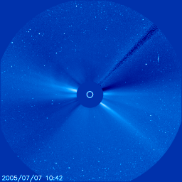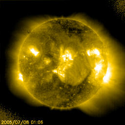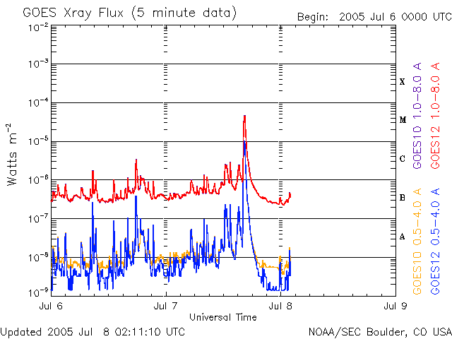 2005/ 7/ 8 11:18 更新 これから、太陽風に乱れが発生して、磁気圏が活動的になる可能性があります。また、中規模フレアが発生し、CMEも観測されています。 担当 篠原 8日1時(世界時7日16時)に、786黒点群でM4.9の中規模フレアが発生しました。 今日の1枚目の写真にその様子を掲載しています。 フレアは太陽のほぼ中心で発生しています。 786黒点群の活動には引き続き注意が必要でしょう。 また、これに先立って、7日20時(世界時7日11時)頃に786黒点群のすぐ下の領域で、 フィラメント消失と思われる爆発現象が発生しています。 SOHO衛星のEIT195カメラがその様子を捉えていましたので、その動画を2枚目に掲載しています。 写真の中心部から、黒い筋や白い筋が吹き出して行く様子を見る事ができます。 これら2つの爆発現象に伴って、CME(太陽ガスの放出現象)が発生しています。 やや淡く、時間的にも重なっているため見にくいのですが、 今日の3枚目のLASCO C3カメラの動画をご覧ください。 初めに吹き出した高速のガスを追いかける様に、次のガスが噴出しているのが見えます。 これらのCMEは、ともに太陽の中心付近で発生していますので、地球への影響は間違いないでしょう。 高速の太陽ガスは、大まかに考えて2〜3日の時間をかけて地球にやってきます。 ですので、明後日、10日の未明からお昼にかけて地球に来る可能性があると思います。 太陽風の速度が急上昇し、磁場強度が強まって、 オーロラ活動を活発にしたり、磁気嵐を発生させる可能性があります。 さて、現在の太陽風は、速度310km/秒、磁場強度5〜7nTと、 磁場強度がやや強まっているものの、だいたい穏やかな状態です。 AE指数もだいたい静穏ですが、小さな活動がいくつか現れています。 これは、太陽風の磁場が南を向いたことの影響です。 (速度が低いために、小さな活動でとまっています) 今日の昼か、その後くらいに、6日に788黒点群で発生したCMEの高速太陽風が地球に到達すると思われます。 小規模の乱れだと思いますが、太陽風が変化して、磁気圏が活動的になるかもしれません。 また、コロナホールの影響も、これから明日にかけて見られるかもしれません。 SOHO EIT284の写真では、南側(下側)のコロナホールが赤道付近に細くのびているのが見えています。 ただ、こちらの乱れも小規模だろうと思います。 これから数日間、いろいろな要因が絡まって、太陽風は複雑な変化を見せそうです。 GOES衛星が観測したM4.9の中規模太陽フレア。8日1時(世界時7日16時)。 (c) NOAA/SEC ![]() SOHO衛星EIT195カメラが観測した、7日20時(世界時7日11時)頃に発生したフィラメント消失。 (c) ESA & NASA ![]() SOHO衛星LASCO C3カメラが観測した、7〜8日に発生した2つのCME(太陽ガスの放出現象)。 (c) ESA & NASA ![]() SOHO衛星のEIT284カメラの映像 (c) SOHO (ESA & NASA)