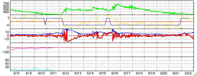 ACEが観測した太陽風の磁場(1番上の枠、白線は全体の強度、赤線は南北成分) および、太陽風の密度(3番目の橙線)、速度(4番目の黄線) (c) NOAA/SEC ![]() リアルタイムAE指数 下段のAEグラフの値が高くなると、オーロラ活動が活発化しています。 (c) 京都大学, NICT ![]() GOES衛星の太陽X線データ (c) NOAA/SEC ![]() SOHO衛星のMDIカメラによる太陽黒点 (c) SOHO (ESA & NASA) ![]() 27日の太陽周期に合わせたデータプロット (太陽風版) 太陽が同じ面を地球に向けていた27日前の変化から、今後を予想することができます。 (c) NICT