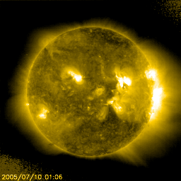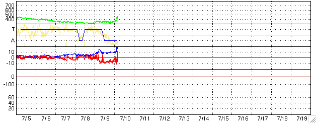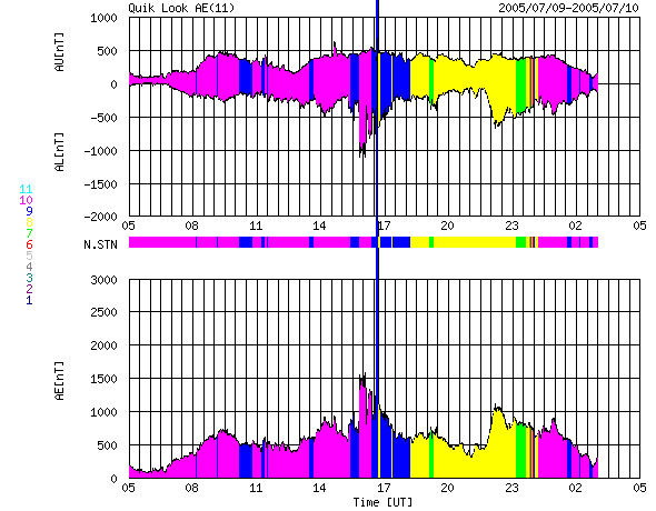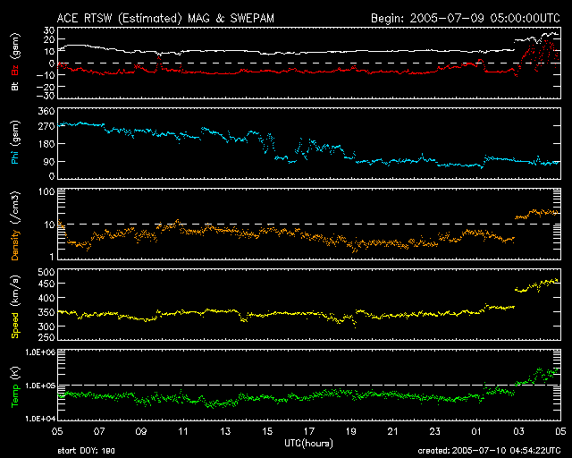 2005/ 7/10 13:58 更新 南向き太陽風磁場の影響で、オーロラ活動が活発になり弱い磁気嵐も発生しています。衝撃波が到来しました。 担当 篠原 9日14時(世界時9日5時)頃から始まった太陽風磁場の南向き傾向が、ほぼ1日にわたって続きました。 速度は350km/秒と遅いものの、-8nT程度の強い南向きが延々と続きました。 このため、磁気圏の活動が活発化し、オーロラ活動や磁気嵐が発生しています。 AE指数のグラフを見ると、500〜1000nTの活発な活動が連続的に観測されています。 最大では1500nTに達する強いオーロラ活動も発生しています。 また、弱い磁気嵐も発生しているようで、 Dstの速報値では-50nT程度の磁場強度の減少が観測されています。 (磁場強度が減少するほど、磁気嵐は発達しています) そして、この南向き磁場がどこまで続くのだろうかと思っていた先ほど、 10日12時(世界時10日3時)に新しい太陽風の乱れが地球にやってきました。 太陽風の速度が350km/秒から450km/秒に上昇し、磁場強は10nTから25nTに強まっています。 速度の乱れはそれほどではありませんが、磁場強度が強まっており、 一気に南向きになると(現在は北向きです)、一層激しい磁気圏の乱れが発生するでしょう。 しばらくの間、太陽風の変化に注意が必要です。 これは、7日から8日にかけて発生したCME(太陽ガスの放出現象)による 高速の太陽風が到来したものだと考えられます。 CMEは2回にわたって発生しており、この後、もう一段の乱れが発生する可能性もあります。 昨日のニュースで、9日1時(世界時8日16時)にフィラメント消失の様な変化が見られたと記しましたが、 SOHO LASCOカメラの画像では、はっきり分かるほどのCMEは観測されていませんでした。 太陽面では、786黒点群が新たな中規模フレアを発生させています。 今朝、10日7時(世界時9日22時)に発生しており、規模はM2.8です。 そして、このフレアにともなってCMEも発生しています。 LASCO C3カメラの写真を参照してください。 右上方向にやや濃く、白いガスが飛び出しています。 このCMEによ高速の太陽風は、12日の夜以降に地球へやってくることになりそうです。 太陽風の乱れ方に応じて、オーロラ活動が活発になったり、磁気嵐が発生することが予想されます。 引き続き、活発な宇宙天気活動が続きそうです。 SOHO衛星のEIT284カメラの映像 (c) SOHO (ESA & NASA)