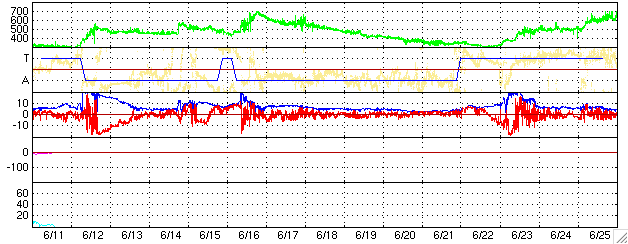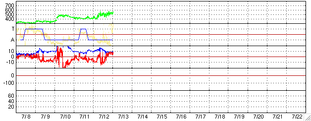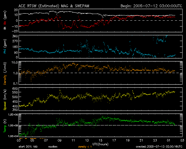 GOES衛星の太陽X線データ (c) NOAA/SEC ![]() SOHO衛星のMDIカメラによる太陽黒点 (c) SOHO (ESA & NASA) ![]() ACEが観測した太陽風の磁場(1番上の枠、白線は全体の強度、赤線は南北成分) および、太陽風の密度(3番目の橙線)、速度(4番目の黄線) (c) NOAA/SEC ![]() リアルタイムAE指数 下段のAEグラフの値が高くなると、オーロラ活動が活発化しています。 (c) 京都大学, NICT ![]() GOES衛星による、静止衛星軌道における高エネルギー電子の変化 (c) NOAA/SEC ![]() 27日の太陽周期に合わせたデータプロット (太陽風版) 太陽が同じ面を地球に向けていた27日前の変化から、今後を予想することができます。 (c) NICT
