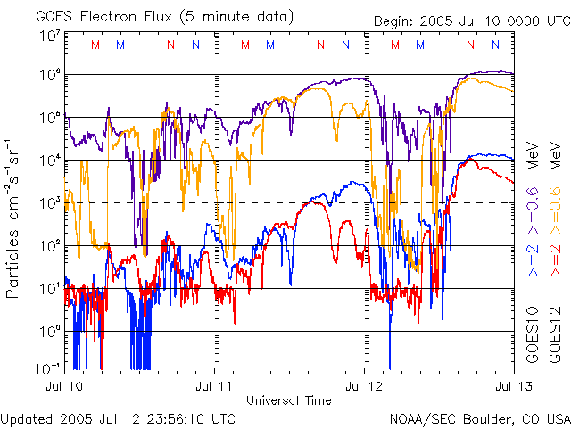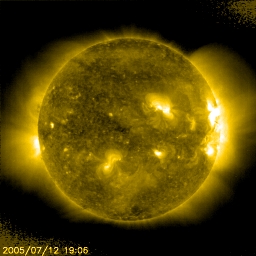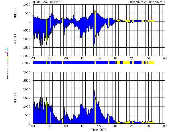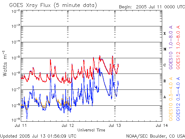 2005/ 7/13 11:04 更新 786黒点群が活発になり、中規模フレアを多く起こしています。太陽風の乱れのため、オーロラがとても活発になりました。 担当 篠原 昨日のニュースで786黒点群がやや活発になっているとお知らせしましたが、 その後更に活動度が上がり、中小規模のフレアを多数起こしています。 主なものでは、12日17時(世界時12日8時)にC8.3の小規模フレア、 12日22時(世界時12日13時)にM1.1の中規模フレア、 13日1時(世界時12日16時)にM1.6の中規模フレア (このフレアは、複数にわたってピークが発生する複雑な形を見せています)、 13日8時(世界時12日23時)にM1.4の中規模フレアなどがあげられます。 X線のグラフを見ると、これら以外にもたくさんの小規模フレアが観測されています。 こちらにGOES衛星によるX線動画があります。 786黒点群は、1日にわたってほとんど連続とも言える様な輝き方をしています。 その活動の様子をどうぞご覧下さい。 これら一連の活動に伴って、CME(太陽ガスの放出現象)が数回発生しています。 一番目立っていた、13日1時(世界時12日16時)以降のCMEの様子を LASCO C3カメラの太陽写真で紹介します。 これらのCMEは、786黒点群がかなり西の端に寄ってから発生しています。 従って、地球に対してはかなり横向きに太陽ガスが飛び出しており、 地球へはガスの端の部分が当たる事になります。 ですので、宇宙天気への影響は大きなものにはならないでしょう。 15日頃の太陽風に、速度や磁場の乱れとして影響が現れる可能性はあります。 太陽風は、速度が500km/秒から550km/秒とやや高速の状態になっています。 これは昨日の昼頃から緩やかに上昇して来たものです。 10日のCMEの影響が、昨夕以降太陽風に見られると予想していましたが、 この辺りの一連の乱れの中に混じってしまったのでしょうか、明確に分かる変化は現れていません。 太陽風磁場が大きく南を向いた影響で、磁気圏のオーロラ活動が一時的にとても活発になりました。 AE指数では、1000nTから、最大で2000nT近くにまで達する大きな変動が観測されています。 今日に日が変わった、13日1時(世界時12日16時)頃から、太陽風磁場は北向きに切り替わりました。 このため、磁気圏へのエネルギーの流れ込みも止まり、オーロラ活動はおとなしくなっています。 ここ数日の786黒点群の活発な活動もあり、もうしばらく太陽風の乱れに注意が必要でしょう。 現在も磁場強度は10nTと高いレベルを保っており、南向きに切り替わると磁気圏はまた大きく乱れます。 786黒点群は既にかなり西に傾いていますので、太陽風に影響が見られるのももう2〜3日程度ではないでしょうか。 GOES衛星の観測によると、放射線帯の高エネルギー電子が急増しています。 GOES10, 12の両衛星で警戒ラインの10の4乗の線を越えています。 密度は更に増加する可能性もあり、衛星の運用では注意が必要でしょう。 SOHO衛星のEIT284カメラの映像 (c) SOHO (ESA & NASA)