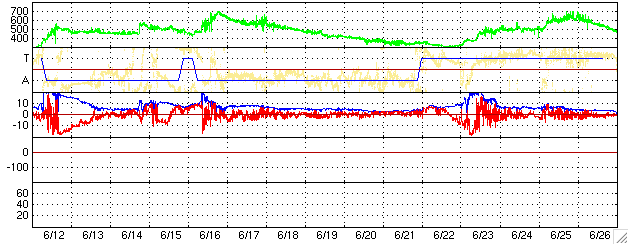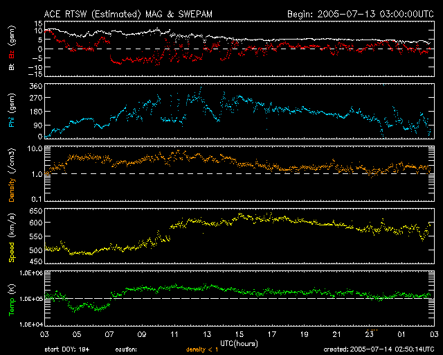 GOES衛星の太陽X線データ (c) NOAA/SEC ![]() SOHO衛星のMDIカメラによる太陽黒点 (c) SOHO (ESA & NASA) ![]() GOES衛星の太陽放射線データ (c) NOAA/SEC ![]() ACEが観測した太陽風の磁場(1番上の枠、白線は全体の強度、赤線は南北成分) および、太陽風の密度(3番目の橙線)、速度(4番目の黄線) (c) NOAA/SEC ![]() リアルタイムAE指数 下段のAEグラフの値が高くなると、オーロラ活動が活発化しています。 (c) 京都大学, NICT ![]() 27日の太陽周期に合わせたデータプロット (太陽風版) 太陽が同じ面を地球に向けていた27日前の変化から、今後を予想することができます。 (c) NICT