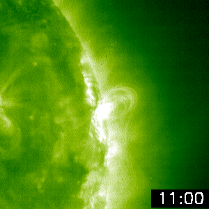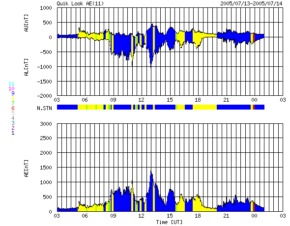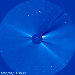 2005/ 7/14 11:56 更新 786黒点群がさらに活発化し、中規模フレアを多発させています。太陽風は高速状態が続いています(570km/秒)。 担当 篠原 活発化していた786黒点群がさらにその勢いを強め、中規模フレアを多数発生させています。 昨日のニュース以降のフレアをあげると、 13日7時半(世界時12日22時半)にM1.5の中規模フレア 13日11時半(世界時13日2時半)にM1.1の中規模フレア 13日21時(世界時13日12時)にM3.2の中規模フレア 13日23時(世界時13日14時)にM5.0の中規模フレア 14日4時(世界時13日19時)にM1.2の中規模フレア 14日7時(世界時13日22時)にM1.2の中規模フレア と目の回るような忙しさです。 X線動画では、ほとんど連続的に光り続けているとも言える活発な786黒点群の様子がよく見えます。 これら一連の活動に伴って、CME(太陽ガスの放出現象)も多く発生しています。 約1日分のSOHO衛星LASCO C3カメラの太陽写真を使って動画を作成しました。 次々とガスが噴き出して行く様子をご覧ください。 同様に、SOHO衛星EIT195カメラで、786黒点群付近の美しいプロミネンスの動きを見る事ができました。 こちらもご覧ください。 また、太陽放射線(非常に高速のプロトン粒子群)の量が増加しています。 GOES衛星の観測では、10PFUを越えています。 引き続き増加を続けそうですので、今後の変化に注意が必要でしょう。 太陽風は、昨日13日20時(世界時13日11時)頃からもう一段速度が上昇し、 570〜620km/秒の高速状態が続いています。 オーロラ活動も太陽風磁場が南を向いたときに、1000nT前後の活発な動きを見せています。 太陽風の速度は、現在は緩やかに低下する傾向が見られていますが、 一連の太陽活動の影響もあり、引き続き様々な乱れ方をすると思われます。 幸いかあるいは残念か、立場によって見方が変わりますが、 活発化した786黒点群は太陽の西の端にあり、吹き出したガスのほとんどは地球から横の方向に向かっています。 ですので、今後の太陽風が大きく乱れるということはないでしょう。 それでも、これだけCMEを吹き出していますので、今後の変化が注目されます。 放射線帯の高エネルギー電子の密度は低下して、ひとまず警戒ラインを割っています。 SOHO衛星LASCO C3カメラが観測した、世界時12〜13日に発生したCME(太陽ガスの放出現象)の様子。 (c) ESA & NASA ![]() SOHO衛星EIT195カメラが観測した、美しいプロミネンスの動き(世界時7月13日)。 (c) ESA & NASA ![]() SOHO衛星のEIT284カメラの映像 (c) SOHO (ESA & NASA)