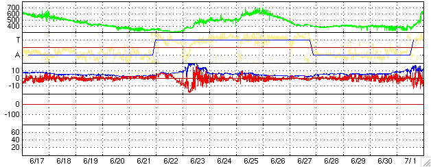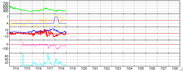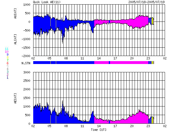 ACEが観測した太陽風の磁場(1番上の枠、白線は全体の強度、赤線は南北成分) および、太陽風の密度(3番目の橙線)、速度(4番目の黄線) (c) NOAA/SEC ![]() リアルタイムAE指数 下段のAEグラフの値が高くなると、オーロラ活動が活発化しています。 (c) 京都大学, NICT ![]() 27日の太陽周期に合わせたデータプロット (太陽風版) 太陽が同じ面を地球に向けていた27日前の変化から、今後を予想することができます。 (c) NICT