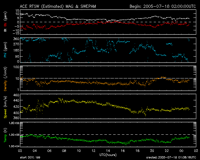2005/ 7/19 10:14 更新 長時間太陽風磁場が南を向いています。磁気圏は活動的な状態が続いています。明日以降、コロナホールの影響が及ぶでしょう。 担当 篠原 太陽風の磁場の南北成分(ACE衛星の図の赤線)が、ずっと南(図でマイナス方向)を向き続けています。 今日掲載しているACEの図を見ると、初めの部分で既に-10nTと強く南を向いています(赤線)。 この時までに4時間ほどこの様な南向きの状態が続いていました(昨日のニュースをご覧ください)。 その後、南向き磁場は半日ほど緩やかに強度を弱めながらも続きます。 19日に日が変わった頃(世界時18日15時頃)、一旦南北成分がほとんど0になりますが、 その後再び南向きが強まり、現在も-3nTほどの弱い値ですが、南を向いています。 この間、太陽風の速度は400km/秒から440km/秒の間にあり、通常の速度でした。 特に速いと言うような状態ではありませんでしたが、ある程度強い南向き磁場が連続していたため、 磁気圏内の活動も活発になっていました。 オーロラの活動指数であるAE指数のグラフを見ると、 図の最初の頃(南向き磁場が-10nTまで強まっていた)に、1000nT程度の活発な変化が観測されています。 その後、磁場の弱まりとともに活動度は下がり、 後半部の再び南向き磁場が強まったところで500nTを越える程度の活動が発生しています。 AEの図の前半部の時間帯では、 Dst指数でも(その前の静穏な時間帯と比較して)-60nT程度の減少が観測されており、 弱い磁気嵐の状態が発生していたようです。 弱まったとはいえ、太陽風磁場は現在も南寄りに推移しています。 この傾向が続く間は、磁気圏活動も刺激を受け続けることになります。 一方、コロナホールが太陽の中心線を過ぎ、西側に進んできました。 SOHO衛星EIT284の太陽写真をご覧ください。 コロナホール全体がちょうど太陽の中心にある感じです。 この穴からは、高速の太陽風が外へ向かって吹き出しています。 高温のガスが外へ吹き飛んでしまっているために、何も無いぽっかり空いた穴の様に写真では見えるのです。 ちょうど今、ここから地球方向へ吹き出している高速の太陽風が、約3日かけて地球へと飛んできます。 その最初の部分が、明日(20日)から明後日(21日)にかけて地球へ届きそうです。 写真で見るコロナホールの位置関係では、明後日(21日)くらいになりそうなのですが、 27日周期の図で前周期の様子を見ると、明日(20日)くらいから太陽風磁場の乱れが発生し、 速度の上昇も始まるかもしれません。 特に前周期は磁場の強まりが大きく(世界時6月23日を見てください)、磁気圏活動も活発になりました。 今周期はどのような変化になるでしょうか。 太陽面は、掲載している写真では黒点が見えない状態になっています。 X線強度も一段と下がっていて、穏やかな状態です。 GOES衛星のX線写真でもかなり暗い太陽になっています。 太陽放射線は、18日0時(世界時17日15時)頃に再び上昇して、 その後20PFUくらいにまで上がっていました。 現在は緩やかにレベルを下げ続けています。 SOHO衛星のEIT284カメラの映像 (c) SOHO (ESA & NASA)