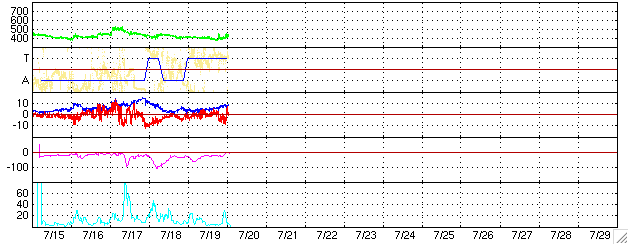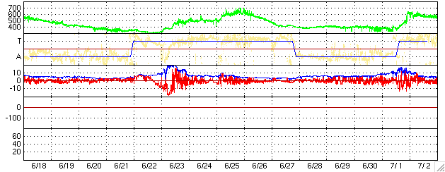 SOHO衛星のMDIカメラによる太陽黒点 (c) SOHO (ESA & NASA) ![]() GOES衛星の太陽X線データ (c) NOAA/SEC ![]() ACEが観測した太陽風の磁場(1番上の枠、白線は全体の強度、赤線は南北成分) および、太陽風の密度(3番目の橙線)、速度(4番目の黄線) (c) NOAA/SEC ![]() リアルタイムAE指数 下段のAEグラフの値が高くなると、オーロラ活動が活発化しています。 (c) 京都大学, NICT ![]() 27日の太陽周期に合わせたデータプロット (太陽風版) 太陽が同じ面を地球に向けていた27日前の変化から、今後を予想することができます。 (c) NICT
