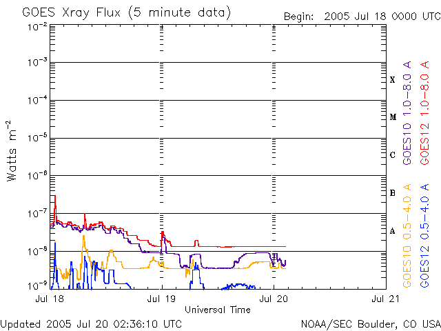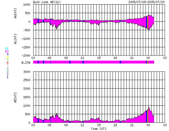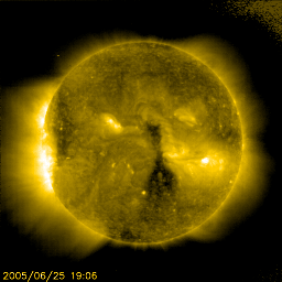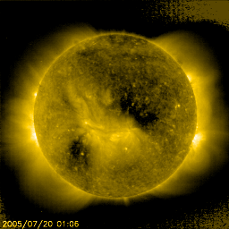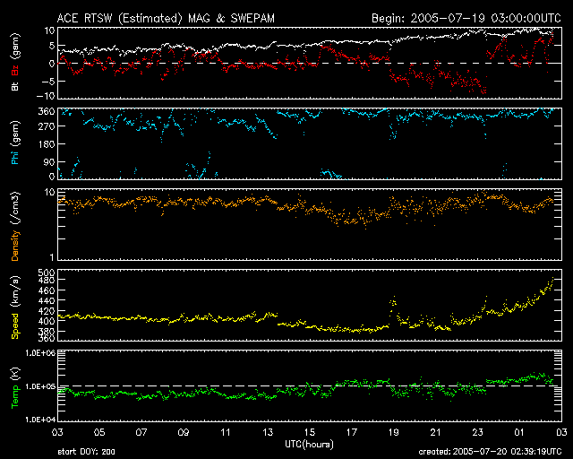 2005/ 7/20 11:45 更新 太陽風の速度上昇が始まっています。今後、太陽風の状況によって、磁気圏が活発に乱れる可能性があります。 担当 篠原 今日の最初の写真で、6月25日から7月19日までの、 SOHO衛星EIT284カメラが撮影した太陽の様子を動画にしてみました。 1日1枚で重ねていますが、一周するにはあと2枚足りません。 最初、暗いコロナホールが広がるだけで、明るいところがほとんど無かった太陽面が、 4分の1周ほどすると、急に明るいところが増え、 やがて全面に明るい部分(黒点群のある活動的な領域)が広がってきます。 後半は、明るい部分が西に去り、太陽面は真ん中にコロナホールが見えるだけの、 ぼんやりした写真になってしまいます。 太陽の表と裏ではありませんが、先週の黒点群がすごくにぎやかだった頃と、 その前後の穏やかな太陽面との様子の違いをご覧下さい。 現在の太陽面は無黒点になっています。 のっぺりした写真になってしまいました。 X線のレベルもかなり低いレベルに下がっています。 もうしばらく、この状態が続きそうです。 太陽風にコロナホールによる変化が始まっています。 初めに、磁場強度がじわじわと上昇してきました。 今日のACEの図の最初で4nTと普通の強さでしたが、右上がりに次第に上昇し、 現在は10nT程度まで強まっています。 一方、速度も遅れて上昇を始めています。 20日7時(世界時19日22時)頃から変化が始まり、それまでの400km/秒から、460km/秒に上がっています。 27日周期の図で、太陽が同じ面を地球に向けていた27日前の前周期の様子と比較します。 すると、セクターの切り替わり(セクターの青線が下から上に跳ね上がるところ)のタイミング、 磁場の強まり始め(IMFの青線)、速度の上がり始め(緑線。やっと上がり始めたところですが)など、 全体的な変化のタイミングがよく一致しています。 この傾向が続くとすると、これから半日ほどかけて更に速度が上昇しそうです。 太陽風の磁場強度が強まっているため、 北を向くか南を向くか(ACEの図の赤線)で、磁気圏は大きく影響を受けます。 現在は北を向いています(赤線がプラスに振れている)が、 今後南に切り替わった時(赤線がマイナスに振れたとき)はオーロラ活動が活発になります。 太陽風の乱れは2〜3日程度続くのではないでしょうか。 SOHO衛星EIT 284カメラによる、6月25日から7月19日までの、25日間の太陽(完全には一周していません)。 (c) ESA & NASA ![]() SOHO衛星のEIT284カメラの映像 (c) SOHO (ESA & NASA)