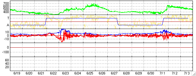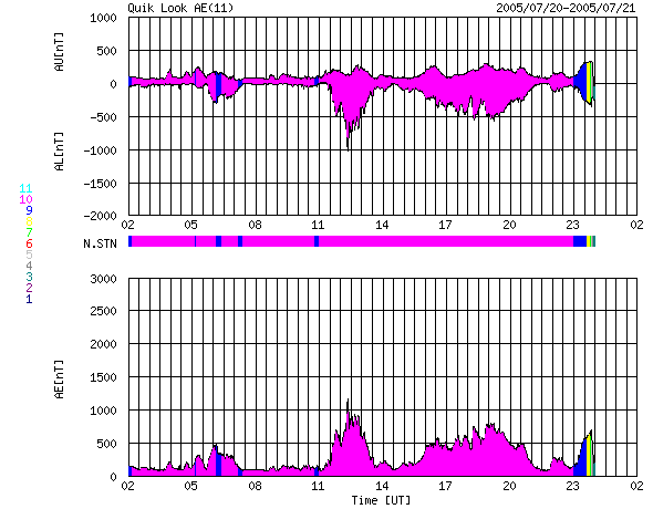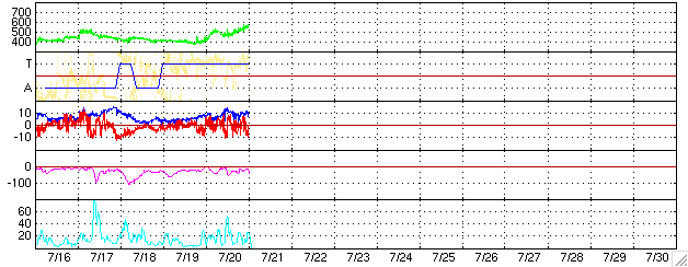 ACEが観測した太陽風の磁場(1番上の枠、白線は全体の強度、赤線は南北成分) および、太陽風の密度(3番目の橙線)、速度(4番目の黄線) (c) NOAA/SEC ![]() リアルタイムAE指数 下段のAEグラフの値が高くなると、オーロラ活動が活発化しています。 (c) 京都大学, NICT ![]() 27日の太陽周期に合わせたデータプロット (太陽風版) 太陽が同じ面を地球に向けていた27日前の変化から、今後を予想することができます。 (c) NICT