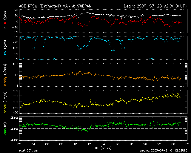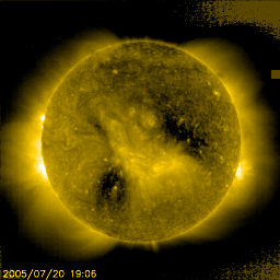 2005/ 7/21 10:19 更新 高速の太陽風が続いています(550km/秒)。磁気圏のオーロラ活動も活発です。太陽は無黒点が続いています。 担当 篠原 コロナホールによる高速太陽風が続いています。 SOHO EIT284の太陽写真をご覧ください。 太陽の右側半分のところに黒い穴が開いています。 ここは太陽の磁場が外側へ向かって開いている場所です。 高温の太陽ガスが開いた磁場に沿って外側へ吹き出しているため、周囲よりも暗く見えているのです。 ここをコロナホールと呼んでいます。 高速太陽風の吹き出し口になっている領域です。 この穴から吹き出した太陽風は3日ほどかけて地球へやってきます。 ガスはまっすぐ吹き出しますので、 本当は穴が太陽の中心に見えている時に、地球へ向かってガスが飛び出しているのですが、 距離が遠いため、ガスが地球へ来るまでに太陽が1/8ほど自転してしまいます。 ですので、今日の写真の様に、コロナホールが太陽の右側の真ん中付近に見える頃に、 高速の太陽風が地球へやってくるのです。 コロナホールは現在まさにこの位置にあります。 コロナホールの広がりを考えると、明日、明後日くらいまで高速の太陽風が続きそうです。 ACE衛星の観測では、現在の太陽風の速度は550km/秒。 磁場強度は10nTとやや強めです。 このため、南向き成分や東西成分が大きくなりやすく、オーロラ活動を刺激しています。 AE指数を見ると、1000nTや800nT規模の活発な活動が観測されています。 高速風はまだ続きますので、引き続き現在のような状態が続きそうです。 太陽は真っ白の無黒点写真になっています。 GOES衛星のX線データはほとんど最低レベルを横ばいしている状態です。 太陽はとても穏やかです。 SOHO衛星のEIT284カメラの映像 (c) SOHO (ESA & NASA)