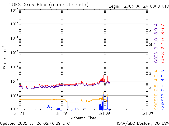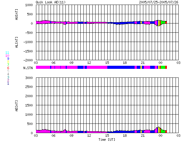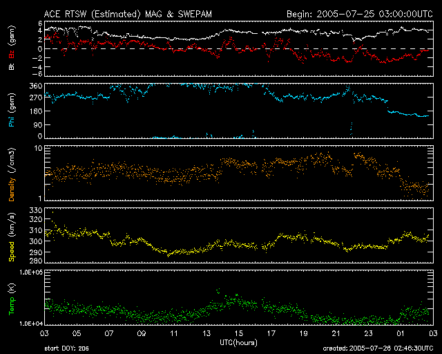 SOHO衛星のMDIカメラによる太陽黒点 (c) SOHO (ESA & NASA) ![]() ACEが観測した太陽風の磁場(1番上の枠、白線は全体の強度、赤線は南北成分) および、太陽風の密度(3番目の橙線)、速度(4番目の黄線) (c) NOAA/SEC ![]() リアルタイムAE指数 下段のAEグラフの値が高くなると、オーロラ活動が活発化しています。 (c) 京都大学, NICT ![]() GOES衛星の太陽X線データ (c) NOAA/SEC ![]() | |||||||||||||||||||||||||||||||||||||||||
