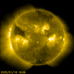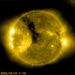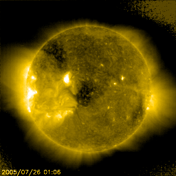 2005/ 7/26 11:46 更新 地球の磁気圏は穏やかです。コロナホールが太陽の中心に達しています。 担当 篠原 太陽風は速度300km/秒と低速です。磁場強度は2〜4nT。 弱い南向きの時間帯もありますが、速度が遅いため、 地球の磁気圏はとても穏やかです。 SOHO EIT284の太陽写真を見ると、コロナホールが太陽の中心に達しています。 コロナホールとは、太陽の磁場が外に向かって広がっている場所で、 太陽から高速のガスが飛び出しています。 そのため、ここは暗く穴の様に見えています。 今日の7月26日の写真と、 太陽のちょうど1回転分にあたる、27日前(6月29日)の写真を並べてみます。 すると、ほぼ同じ位置に暗いコロナホールが見えているのが分かります。 ただし、コロナホールの真ん中に明るい部分ができていて、コロナホールは2つに分断されてしまいました。 この明るい部分は、791黒点群がある場所です(黒点の写真をご覧下さい)。 白色光では黒く見える黒点ですが、違う光で見ると、むしろ周囲より明るく見えるのです。 この2枚の写真で分かる様に、太陽面のコロナホールはゆっくりと変化して行きます。 それは、太陽内部の磁場の構造の変化に起因するものです。 今年の1月から7月までの、半年間にわたる太陽の変化を動画にしました。 今日の1枚目の写真がそれです。 27日ごとの写真を重ねて作っています。 半年前は2つの別のコロナホールだったものが、くっついて、 ひとつの濃いコロナホールになったようにも見えます。 さて、太陽面は、791黒点群がやや大きくなっている様です。 とはいえ、活動度は低く、小規模のフレアを起こす可能性がある程度です。 SOHO衛星EIT 284カメラによる、2005年1月から2005年7月までのコロナホールの長期変化。 (c) ESA & NASA ![]() SOHO衛星のEIT284カメラの映像 (c) SOHO (ESA & NASA)