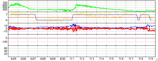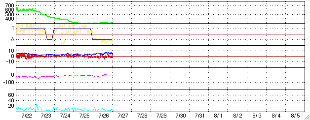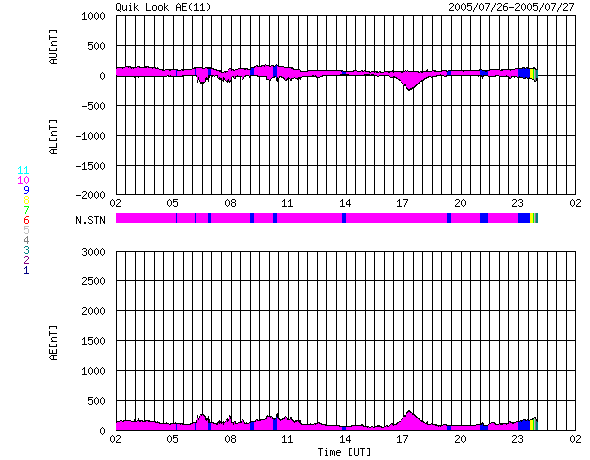 ACEが観測した太陽風の磁場(1番上の枠、白線は全体の強度、赤線は南北成分) および、太陽風の密度(3番目の橙線)、速度(4番目の黄線) (c) NOAA/SEC ![]() リアルタイムAE指数 下段のAEグラフの値が高くなると、オーロラ活動が活発化しています。 (c) 京都大学, NICT ![]() 27日の太陽周期に合わせたデータプロット (太陽風版) 太陽が同じ面を地球に向けていた27日前の変化から、今後を予想することができます。 (c) NICT