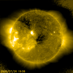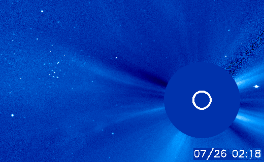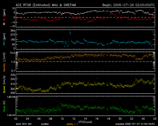 2005/ 7/27 10:51 更新 太陽風は低速で(310km/秒)、磁気圏は穏やかです。太陽のフレア活動も穏やかです。 担当 篠原 また宇宙天気の話から外れてしまいますが、 SOHO衛星のLASCO C3カメラの写真に、 かに座にあるプレセぺと呼ばれる散開星団が見えていますので紹介します。 かに座は太陽の通り道にあるので、1年に1回、この時期に太陽観測衛星の視野の中に入ってくるのです。 今、ほぼ太陽と重なり合う位置に来ていて、動画のページで接近の様子を楽しむ事ができます。 この動画はいずれ消えてしまいますので、プレセペと太陽の部分を切り出した動画を作ってみました。 普通の方法では見る事のできない、真夏のかに座です。 太陽は低速状態が続いています。速度は300〜310km/秒で安定しています。 磁場強度は5nT前後と、これまでよりはやや上がってますが、通常の強さです。 南向き磁場の時間帯も多いようですが、AE指数のグラフにはほとんど変化が無く、 磁気圏は概ね静穏の様です。 ただし、AE観測点はある限られた磁気緯度に分布しており、オーロラ電流の観測には限界があります。 太陽風では、弱いながらも南向き磁場が頻繁に現れていますので、 普段よりも高緯度の地域で小規模のオーロラ活動が発生している可能性はあると思います。 コロナホールは太陽の中心を過ぎ、いよいよ地球に影響を及ぼす(見かけの)位置に近づいています。 今日いっぱいは穏やかな日が続き、明日くらいに太陽風磁場の強まりが発生するのではないでしょうか。 その後、明後日に入る頃から速度の上昇が始まりそうです。 27日周期の図を参考にしてください(図は世界時ですので、注意してください)。 黒点は、791黒点群が太陽のまんなか近くにぽつんとあるだけです。 特に発達はしておらず、活動度は低いままです。 太陽もこのまま穏やかな状態が続きそうです。 SOHO衛星LASCO C3カメラによる、太陽に接近したプレセぺ星団(かに座)。 (c) ESA & NASA ![]() SOHO衛星のEIT284カメラの映像 (c) SOHO (ESA & NASA)