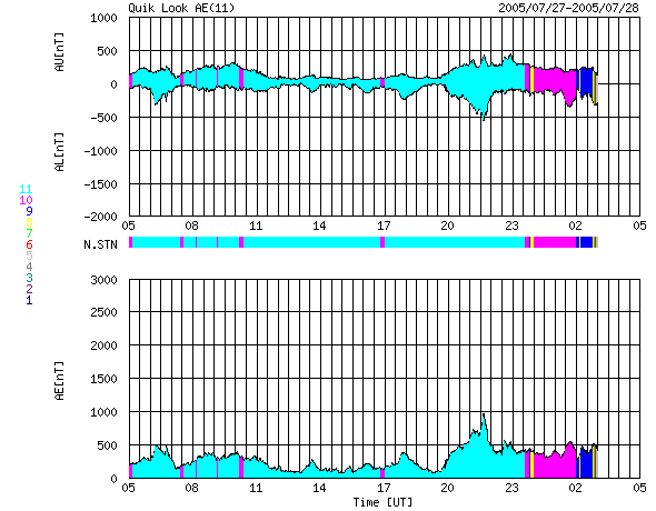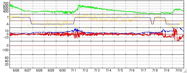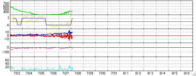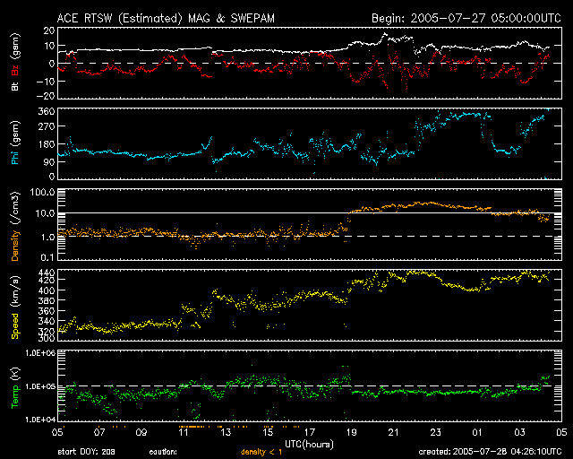 GOES衛星の太陽X線データ (c) NOAA/SEC ![]() SOHO衛星のMDIカメラによる太陽黒点 (c) SOHO (ESA & NASA) ![]() GOES衛星の太陽放射線データ (c) NOAA/SEC ![]() ACEが観測した太陽風の磁場(1番上の枠、白線は全体の強度、赤線は南北成分) および、太陽風の密度(3番目の橙線)、速度(4番目の黄線) (c) NOAA/SEC ![]() リアルタイムAE指数 下段のAEグラフの値が高くなると、オーロラ活動が活発化しています。 (c) 京都大学, NICT ![]() 27日の太陽周期に合わせたデータプロット (太陽風版) 太陽が同じ面を地球に向けていた27日前の変化から、今後を予想することができます。 (c) NICT