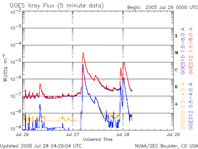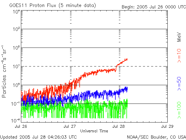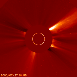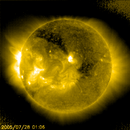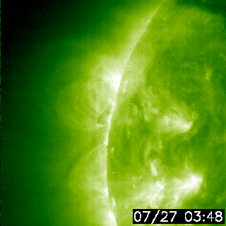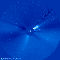 2005/ 7/28 13:27 更新 太陽の東端でM3.7の中規模フレアが発生しました。コロナホールの影響で太陽風速度が上昇しつつあります。 担当 篠原 ここ数日、太陽の向こう側で活発な活動が続いていました。 SOHO衛星のLASCOカメラを見ていると、幾度と無くCME(太陽ガスの放出現象)が発生していたのです。 今月の15日前後に活発化した786黒点群が勢力を保ち続けているのか、 その周辺の別の黒点群による活動と思われます。 今週末あたりに、この黒点群は太陽のこちら側に回って来る見込みでしたので、 今日のニュースの話題として扱おうと考えていました。 ところが、先手を打つ様に、昨日27日13時半(世界時27日4時半)に、 まだ太陽の向こう側にいる活動領域で大きなフレアが発生し、 地球ではM3.7の中規模フレアとして観測されました。 直接見える位置で発生していた場合は、更に大きなフレアとして観測されたことでしょう。 このフレアに伴って、太陽放射線(非常に高速のプロトン粒子)の強度が増加しています。 現在、20PFUを越える程度にまで増加しています。 衛星の運用などでは注意してください。 また、大規模なCMEが発生しています。 地球にとっては横方向に発生していますので、ほとんど影響はないと思いますが、 SOHO衛星で太陽ガスが飛び出す美しい映像が撮影されています。 EIT195、LASCO C2、LASCO C3と、それぞれ異なる場所の様子を動画にしましたのでご覧下さい。 また、こちらの動画ページで、GOES衛星のX線画像の様子を見る事ができます。 この活動領域では、今朝、28日9時(世界時28日0時)にもM1.0のフレアを観測しており、 今後、Xクラスの大規模フレアを起こす可能性もあります。 特に、今週末あたり、太陽のこちら側に回り込んでからは十分な注意が必要でしょう。 現在の太陽風ですが、コロナホールの影響が見え始めています。 初めに磁場強度が10nTに強まり、続いて速度が450km/秒に上がっています。 太陽風磁場のやや強い南向きと、速度上昇が重なって、オーロラ活動もやや活発になっています。 これから更に、速度は上昇を続けると思われます。 オーロラの活動も一段と活発化する可能性があります。 SOHO EIT195カメラによる、27日4時半(世界時27日4時半)のM3.7のフレア発生前後の太陽の様子。 (c) ESA & NASA ![]() SOHO LASCO C2カメラによる、このフレアに伴うCMEの様子。太陽の東側から飛び出している。 (c) ESA & NASA ![]() SOHO LASCO C2カメラによる、CMEの様子。更に遠くに向かって太陽ガスが飛び出している。 (c) ESA & NASA ![]() SOHO衛星のEIT284カメラの映像 (c) SOHO (ESA & NASA)