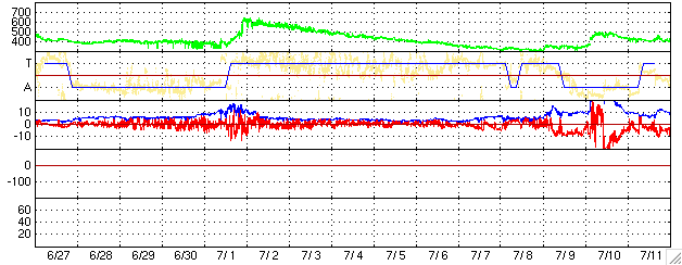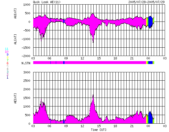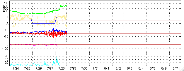 GOES衛星の太陽X線データ (c) NOAA/SEC ![]() SOHO衛星のMDIカメラによる太陽黒点 (c) SOHO (ESA & NASA) ![]() ACEが観測した太陽風の磁場(1番上の枠、白線は全体の強度、赤線は南北成分) および、太陽風の密度(3番目の橙線)、速度(4番目の黄線) (c) NOAA/SEC ![]() リアルタイムAE指数 下段のAEグラフの値が高くなると、オーロラ活動が活発化しています。 (c) 京都大学, NICT ![]() 27日の太陽周期に合わせたデータプロット (太陽風版) 太陽が同じ面を地球に向けていた27日前の変化から、今後を予想することができます。 (c) NICT