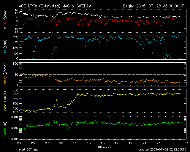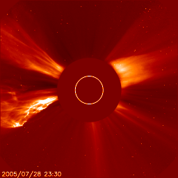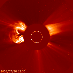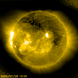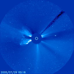 2005/ 7/29 11:12 更新 太陽風の速度が600km/秒に上がっています。オーロラも活動的です。792黒点群が東端から上がってきました。 担当 篠原 M4.8の中規模フレアが発生しています。 発生時刻は29日6時半(世界時28日21時半)。 発生箇所は太陽の東の端(左の端)から上がりつつある792黒点群です (今日の黒点写真では、黒点群の姿はかすかに見えていますが、番号はまだ付けられていません)。 このフレアにともなって、CME(太陽ガスの放出現象)が発生してます。 SOHO衛星のLASCO C2, C3カメラの太陽写真を掲載しています。 東の横方向に飛び出していますので、地球への影響はほとんどないでしょう。 792黒点群は7月中旬に活発な活動を見せていた786黒点群が、 向こう側をぐるっと回って来たものです。 あの後、2週間に渡って活動度を保ち続けていたのです。 今後、どのような活動を続けるのか、 次第に地球へ影響が及ぶ位置に来ますので、注意が必要でしょう。 また、今後も、中規模フレアや、大規模フレアを起こす可能性もありそうです。 太陽風は、一段と速度が上がって、600km/秒の高速状態が安定して続いています。 一方、磁場強度は5nTに低下しています。 高速風の速度が上昇する領域は終わったようです。 27日周期の図を見ると、前周期(7月1〜2日)と比べると、半日程度変化が早まっています。 これから、太陽風の速度は緩やかな低下に転じるでしょう。 2〜3日ほどかけて、通常レベルにもどっていくと思われます。 速度が高くなった事もあり、オーロラの活動度も一段と強まっています。 AE指数のグラフを見ると、1000〜1500nTの激しい変動が観測されています。 引き続き、速度が高い間は活発な活動が続く可能性があります。 フレア活動によって、太陽放射線(非常に高速のプロトン粒子)が強まった状態が続いています。 25PFU前後の値が、約1日継続しています。 衛星運用では、支障が発生しやすい状態が続いています。引き続き注意が必要でしょう。 SOHO衛星のEIT284カメラの映像 (c) SOHO (ESA & NASA)