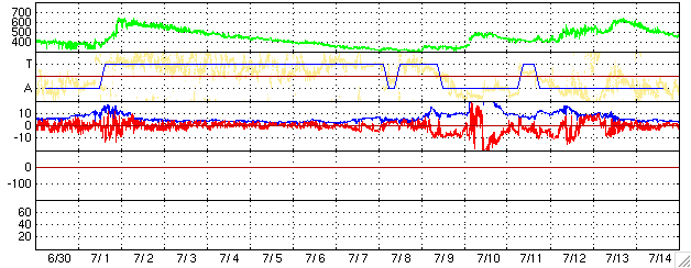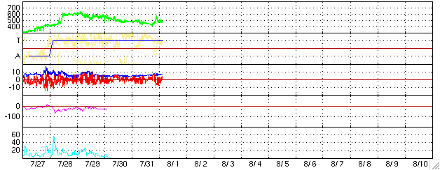 ACEが観測した太陽風の磁場(1番上の枠、白線は全体の強度、赤線は南北成分) および、太陽風の密度(3番目の橙線)、速度(4番目の黄線) (c) NOAA/SEC ![]() リアルタイムAE指数 下段のAEグラフの値が高くなると、オーロラ活動が活発化しています。 (c) 京都大学, NICT ![]() SOHO衛星のMDIカメラによる太陽黒点 (c) SOHO (ESA & NASA) ![]() GOES衛星の太陽X線データ (c) NOAA/SEC ![]() GOES衛星の太陽放射線データ (c) NOAA/SEC ![]() 27日の太陽周期に合わせたデータプロット (太陽風版) 太陽が同じ面を地球に向けていた27日前の変化から、今後を予想することができます。 (c) NICT