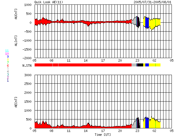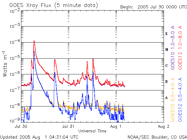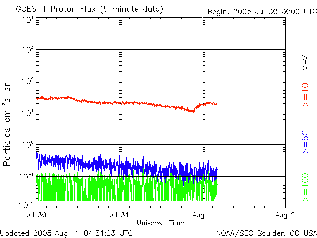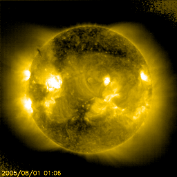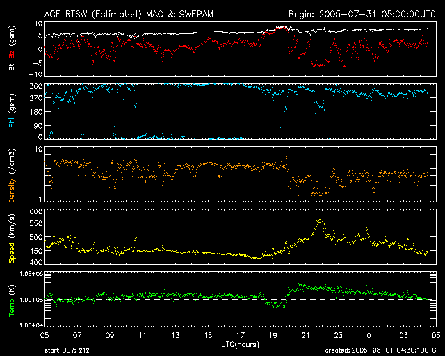 2005/ 8/ 1 13:32 更新 太陽風が一時的に乱れ、オーロラが活発になりました。CMEの影響はまだこれからと思われます。 担当 篠原 8月1日5時(世界時7月31日20時)頃から、一時的に太陽風が乱れています。 太陽風速度が550km/秒に上昇し、磁場強度が8nTにやや強まりました。 途中から磁場が南向きになったため、小規模ですがオーロラ活動を刺激しています。 AE指数で500nT前後の活動が見られています。 太陽風は速度がやや下がって、450km/秒になっています。 この乱れは、昨日お知らせしたX1.3の大規模フレアにともなうCMEの影響ではないでしょう。 これから今日の夜にかけて、太陽風に新たな乱れが発生する可能性があります。 擾乱の到着が遅れるほど、太陽ガスの速度が遅い事を意味していますので、 乱れは小規模にとどまります。 太陽風磁場が南を向くと、磁気嵐が発達したり、オーロラ活動が活発になります。 今日一日は注意が必要でしょう。 X1.3の大規模フレアに続いて発生した、C8.9の小規模フレアでもCMEが観測されています。 こちらはより小規模でしょうが、連続で複雑な太陽風の乱れを起こすかもしれません。 太陽では、792黒点群は規模を保っています。 31日21時(世界時30日12時)にもM1.1の中規模フレアを起こしています。 引き続きフレア活動に対して注意が必要です。 太陽放射線は20PFUのやや高いレベルが続いています。 こちらも長時間続いていますので、注意が必要でしょう。 SOHO衛星のEIT284カメラの映像 (c) SOHO (ESA & NASA)