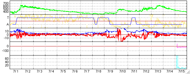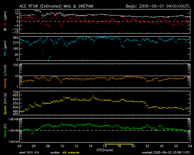 ACEが観測した太陽風の磁場(1番上の枠、白線は全体の強度、赤線は南北成分) および、太陽風の密度(3番目の橙線)、速度(4番目の黄線) (c) NOAA/SEC ![]() リアルタイムAE指数 下段のAEグラフの値が高くなると、オーロラ活動が活発化しています。 (c) 京都大学, NICT ![]() SOHO衛星のMDIカメラによる太陽黒点 (c) SOHO (ESA & NASA) ![]() GOES衛星の太陽X線データ (c) NOAA/SEC ![]() GOES衛星の太陽放射線データ (c) NOAA/SEC ![]() 27日の太陽周期に合わせたデータプロット (太陽風版) 太陽が同じ面を地球に向けていた27日前の変化から、今後を予想することができます。 (c) NICT