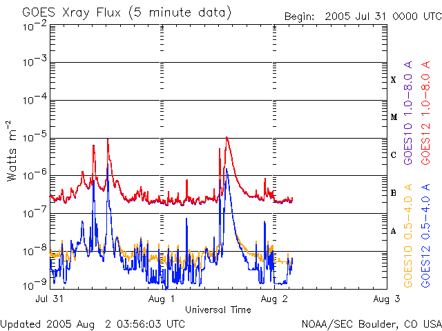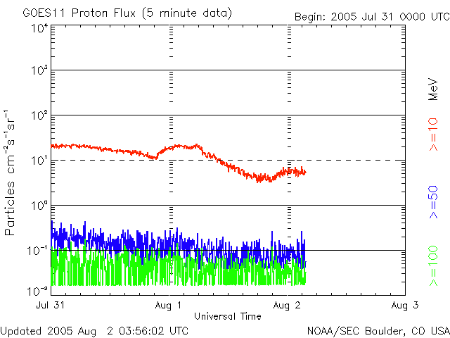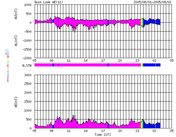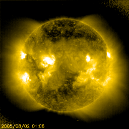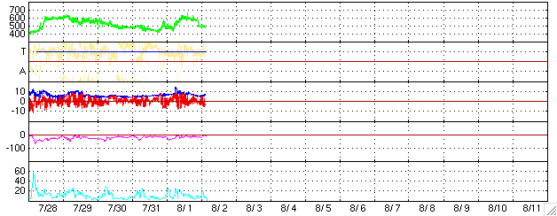 2005/ 8/ 2 13:00 更新 CMEの影響で、太陽風が高速になりました。磁気圏はやや活発になった程度でした。 担当 篠原 1日15時(世界時1日6時)頃、太陽風に不連続な変化が発生しました。 磁場強度が8nTから15nTに急に強まり、密度も増加しています。 速度はあまり変化が無く、500km/秒から550km/秒に上がった程度です。 CMEによって吹き出した太陽ガスが地球にやってきたために起きた変化だと思われます。 ガスの吹き出した方向が地球に対して横を向いていたため、 ガスのかたまりの端の方が地球にやって来ました。 そのためあまり大きな乱れにならなかったのでしょう。 太陽風の速度はその後ゆっくりと上がって、600km/秒になり、半日ほど速度の高い状態が続きました。 現在は450km/秒に落ちています。 太陽風磁場の南北成分は、南に北にと緩やかに振れるような変化を見せています。 ただ、どちらかというと北よりの傾向が強かったようで、磁気圏はあまり大きく乱れてはいません。 オーロラの活動を示すAE指数を見ると、500nT前後の比較的小規模な活動が連続的に発生していた様です。 792黒点群はまだ大きな規模を保っています。 1日22時(1日13時)にはM1.0の中規模フレアを起こしています。 今回もCME(太陽ガスの放出現象)が発生しています。 792黒点群は太陽の中心に近づいて来ていることから、地球への影響も起こりやすくなっています。 今回のCMEの影響は4日の午前くらいになりそうです。 今後もフレア活動に対する注意が必要です。 太陽放射線の強度は低下を続けており、10PFUを切りました。 現在は5PFU程度です。 このまま大きなフレアがなければ、順調に下がっていくでしょう。 SOHO衛星のEIT284カメラの映像 (c) SOHO (ESA & NASA)