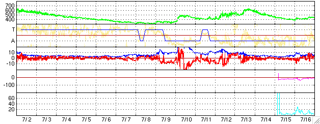 ACEが観測した太陽風の磁場(1番上の枠、白線は全体の強度、赤線は南北成分) および、太陽風の密度(3番目の橙線)、速度(4番目の黄線) (c) NOAA/SEC ![]() リアルタイムAE指数 下段のAEグラフの値が高くなると、オーロラ活動が活発化しています。 (c) 京都大学, NICT ![]() SOHO衛星のMDIカメラによる太陽黒点 (c) SOHO (ESA & NASA) ![]() GOES衛星の太陽X線データ (c) NOAA/SEC ![]() 27日の太陽周期に合わせたデータプロット (太陽風版) 太陽が同じ面を地球に向けていた27日前の変化から、今後を予想することができます。 (c) NICT