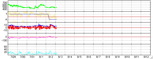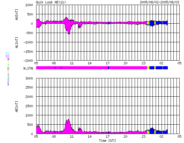 2005/ 8/ 3 13:24 更新 太陽風はやや高速ですが、磁場が北向きだったため磁気圏は穏やかです。792, 794黒点群が活動的になっています。 担当 篠原 太陽風は450〜500km/秒程度で、やや高速な状況です。 磁場強度が一時的に強まって、12nTくらいに強まる変化が見られています。 しかし、南北成分はほとんど北向きのままでしたので、地球への影響はほとんどありませんでした。 AE指数を見ると、一カ所だけ700nTの短時間の変化が現れていますが、 その他はほとんど変化がありません。 現在は磁場強度は5nTに戻っています。 一方で、南北成分は南寄りに変わってきており、今後オーロラが活動的になるかもしれません。 8月1日22時(1日13時)に発生したM1.0の中規模フレアによるCMEの影響が、 明日、4日の午前中くらいに地球に及ぶと思われます。 太陽風に乱れが発生して、磁気圏が活動的になる可能性があります。 太陽面では、792黒点群とともに、794群が活動的になっています。 GOES衛星のX線画像を見ていると、短時間のフレアが頻繁に発生しています。 3日3時半(世界時2日18時半)には、M4.3の中規模フレアが発生しました。 今後も、中規模クラスのフレア活動が起こりそうです。 SOHO衛星のEIT284カメラの映像 (c) SOHO (ESA & NASA)