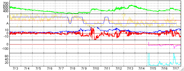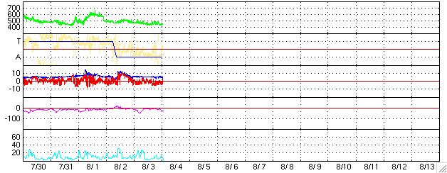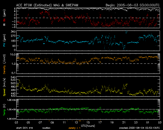 SOHO衛星のMDIカメラによる太陽黒点 (c) SOHO (ESA & NASA) ![]() GOES衛星の太陽X線データ (c) NOAA/SEC ![]() ACEが観測した太陽風の磁場(1番上の枠、白線は全体の強度、赤線は南北成分) および、太陽風の密度(3番目の橙線)、速度(4番目の黄線) (c) NOAA/SEC ![]() リアルタイムAE指数 下段のAEグラフの値が高くなると、オーロラ活動が活発化しています。 (c) 京都大学, NICT ![]() 27日の太陽周期に合わせたデータプロット (太陽風版) 太陽が同じ面を地球に向けていた27日前の変化から、今後を予想することができます。 (c) NICT