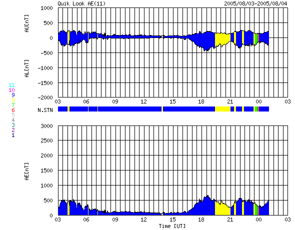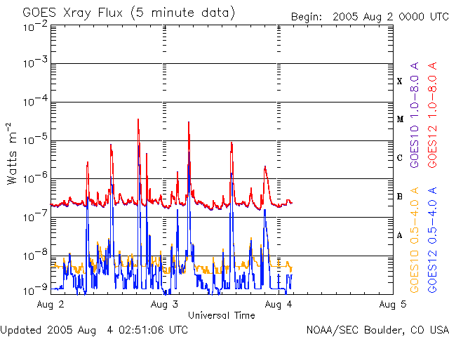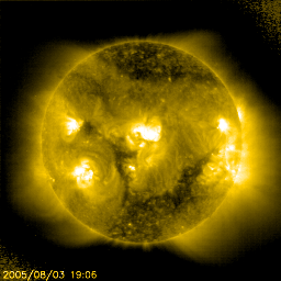 2005/ 8/ 4 11:53 更新 794黒点群が活動度を増しています。太陽風、磁気圏は概ね穏やかです。 担当 篠原 太陽では792、794黒点群が活発に活動を続けています。 GOES衛星によるX線動画を見ると、 ふたつの黒点群が競うように爆発を繰り返しています。 昨日のニュース以降では、3日14時(世界時3日5時)にM3.4の中規模フレアが、 3日23時(世界時3日14時)にC9.3の大きめの小規模フレアがともに794黒点群で発生しています。 794黒点群は規模も拡大しつつあり、今後も注意が必要でしょう。 一方、792群は活動は活発に続けていますが、規模が小さくなる傾向にあるようです。 太陽風は速度450km/秒で、ほぼ通常の状態です。 8月1日のCMEによる乱れが発生するかと予想していましたが、今のところまだ何も見えません。 時間が遅くなるほど、乱れの速度も遅くなっていますので、地球への影響は小さくなります。 今日いっぱいは注目する必要があります。 太陽風磁場の強度は5nT。揺れながらですが、-3nT前後の南向きが続いています。 このため、オーロラの活動度を示すAE指数には500nT前後の小規模の活動が見られています。 速度が速くなく、南向きも比較的弱いのでこの程度の乱れになっているのでしょう。 SOHO EIT284の太陽写真では、太陽の右半分の下寄りにコロナホールが見えています。 コロナホールは更に南(下)へ伸び、南極付近へ広がっています。 このコロナホールの影響が今後見られるかもしれません。 27日周期の図で、前回のこのコロナホールの影響を調べると、 南に寄りすぎていたのか、目立った乱れは発生しなかったようです。 (7月10日の大きな乱れは、CMEによる突発的な現象です) 今回もこのまま穏やかに過ぎていくかもしれません。 SOHO衛星のEIT284カメラの映像 (c) SOHO (ESA & NASA)