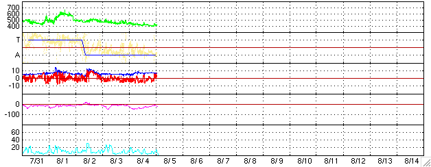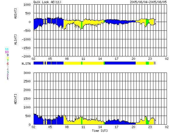 ACEが観測した太陽風の磁場(1番上の枠、白線は全体の強度、赤線は南北成分) および、太陽風の密度(3番目の橙線)、速度(4番目の黄線) (c) NOAA/SEC ![]() リアルタイムAE指数 下段のAEグラフの値が高くなると、オーロラ活動が活発化しています。 (c) 京都大学, NICT ![]() 27日の太陽周期に合わせたデータプロット (太陽風版) 太陽が同じ面を地球に向けていた27日前の変化から、今後を予想することができます。 (c) NICT