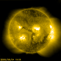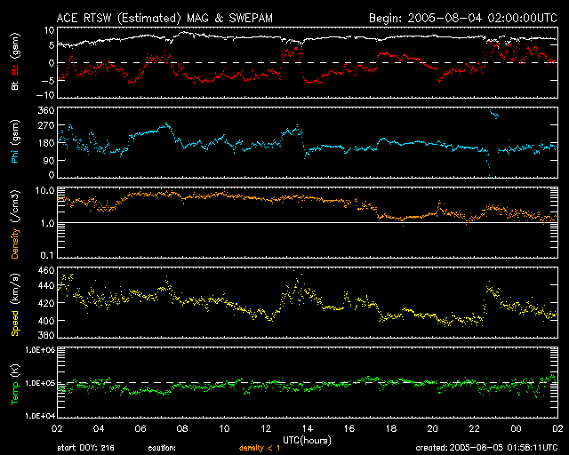 2005/ 8/ 5 10:59 更新 太陽風は概ね静穏です。磁気圏では小規模のオーロラ活動が続いています。 担当 篠原 太陽風は速度400km/秒で穏やかな状態が続いています。 結局、昨日あたりに来るのではないかと思われた、CMEによる太陽風の乱れは発生しませんでした。 太陽の西側(右側)にはコロナホールも見えていましたが、こちらの影響も特になかったようです。 現在の磁場強度は6nT。-4nT前後の南向き成分が比較的長い時間現れています。 そのため、オーロラ活動は小規模ですが300〜500nT程度の変動が連続的に発生しています。 速度が普通のレベルですので、この程度の活動にとどまるでしょう。 SOHO EIT284の太陽写真を見ると、太陽の中心に細長くコロナホールと思われる影が見えています。 ちょうど太陽の中心に来ていますので、これから3日後くらいに地球へ影響が及ぶ事になりますが、 この細さでは目立った変化は起こらないかもしれません。 こういう場合は、27日周期の図が参考になるのですが、 ちょうど27日前のこの期間(7月10〜14日の乱れ)は、 太陽でCMEが頻繁に起こっていたため参考にはしにくい状況です。 太陽黒点の写真を見ると、792、794群が目立っています。 792群は黒点群としてはやや縮小の傾向にあるようです。 一方、794群は規模を保っており、フレアもたびたび起こしています。 昨日、4日14時半(世界時4日5時半)にはC8.4の小規模フレアを起こしています。 このフレアに続いて、CME(太陽ガスの放出現象)が発生し、 SOHO LASCO C3カメラが太陽の左下に向かってガスが吹き出している様子を捉えています。 792、794黒点群は引き続き中規模フレアを起こす可能性があります。 794群は次第に太陽の中心に近づいており、今後のCMEでは地球へも影響が及びそうです。 SOHO衛星のEIT284カメラの映像 (c) SOHO (ESA & NASA)