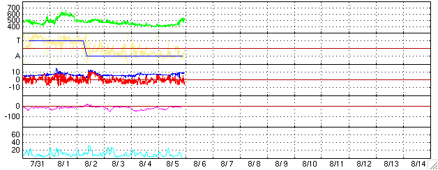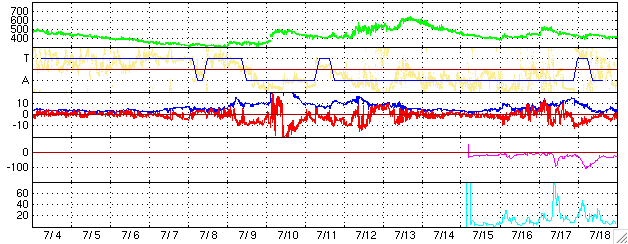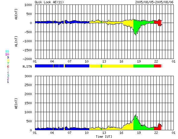 ACEが観測した太陽風の磁場(1番上の枠、白線は全体の強度、赤線は南北成分) および、太陽風の密度(3番目の橙線)、速度(4番目の黄線) (c) NOAA/SEC ![]() リアルタイムAE指数 下段のAEグラフの値が高くなると、オーロラ活動が活発化しています。 (c) 京都大学, NICT ![]() 27日の太陽周期に合わせたデータプロット (太陽風版) 太陽が同じ面を地球に向けていた27日前の変化から、今後を予想することができます。 (c) NICT