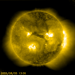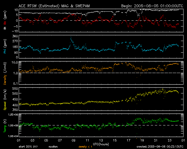 2005/ 8/ 6 09:21 更新 太陽風の速度がやや上昇しています。コロナホールの影響と思われます。太陽のフレア活動はやや落ち着いています。 担当 篠原 6日0時(世界時5日15時)頃から、太陽風の速度が緩やかに上昇を始めました。 現在は520km/秒と、やや高速になっています。 これは、SOHO EIT284の太陽写真で、 西側(右側)の端に近づいているコロナホールの影響ではないかと思われます。 速度はまだいくらか上がりそうですが、大きく上昇をすることはないでしょう。 太陽風の磁場強度も、速度上昇にやや先立つ形で始まっていました。 現在は10nT近くに強まっています。 速度の上昇が始まった頃から、南向きの傾向を持つようになっています。 -5nT程度の南向き磁場が頻繁に現れており、オーロラ活動が刺激を受けています。 AE指数のグラフを見ると、800nT規模の活動が発生しています。 今後も、同様の活動が続きそうです。 コロナホールの規模から考えて、今回の高速風はそれほど長くは続かないでしょう。 ですが、SOHO EIT284の太陽写真を見ると、別のコロナホールが、 太陽の中心付近に細長く見えています。 この影響が明日7日の夜以降に地球に及びそうです。 一方、5日16時(世界時5日7時)に、792黒点群でC2.8の小規模フレアが発生しました。 継続時間の長いタイプのフレアで、CME(太陽ガスの放出現象)を起こしています。 この影響もまた、明後日の7日頃にやってきそうです。 太陽風の速度が上昇して、オーロラ活動が活発になるなどの乱れが発生する可能性があります。 792、794の両黒点群が太陽の真ん中あたりに見えていますが、 フレアの活動度としては低下傾向にあるようです。 GOES衛星のX線グラフを見ると、フレアの発生頻度とピークの高さが下がってきています。 それでも、中規模クラスのフレアを起こす可能性はある様です。 SOHO衛星のEIT284カメラの映像 (c) SOHO (ESA & NASA)