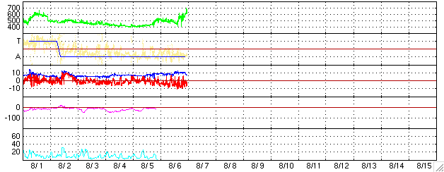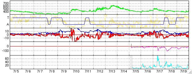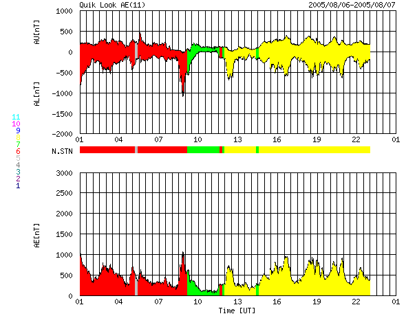 ACEが観測した太陽風の磁場(1番上の枠、白線は全体の強度、赤線は南北成分) および、太陽風の密度(3番目の橙線)、速度(4番目の黄線) (c) NOAA/SEC ![]() リアルタイムAE指数 下段のAEグラフの値が高くなると、オーロラ活動が活発化しています。 (c) 京都大学, NICT ![]() 27日の太陽周期に合わせたデータプロット (太陽風版) 太陽が同じ面を地球に向けていた27日前の変化から、今後を予想することができます。 (c) NICT