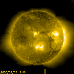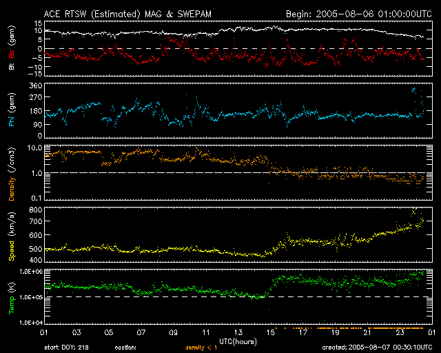 2005/ 8/ 7 09:30 更新 太陽風の速度が一段と上昇しています(650km/秒)。オーロラも活発に活動しています。 担当 篠原 昨日より、500km/秒と太陽風はやや高速の状態が続いていましたが、 7日0時(世界時6日15時)頃から、もう一段の上昇が始まり、 現在650km/秒と更に高速の状態になっています。 SOHO EIT284の太陽写真で、 右半分ほどのところに見えているコロナホールの影響でしょうか。 前周期と様子が変わってきていることもあり、現時点ではやや分かりにくい状況です。 太陽風磁場を見ると、速度の再上昇の前くらいから10nTに強まっていましたが、 現在は5nTに下がってきています。 このことから、速度の上昇はだいたいこのあたりで止まるのではないでしょうか。 太陽風磁場は南北成分を見ると、南寄りが多く現れています。 速度が高まっていることもあり、オーロラ活動が活発になっています。 AE指数のグラフでは700〜1000nT程度の活動が頻繁に発生しています。 現在は速度は高いですが、磁場強度が弱まってきているので、 オーロラの活動はやや低下しそうです。 5日16時(世界時5日7時)に発生したC2.8の小規模フレアによるCME(太陽ガスの放出現象)の影響で、 今日の夕方以降に太陽風に新たな乱れが発生する可能性があります。 太陽のフレア活動は穏やかな状態が続いています。 昨日は目立った規模のフレアは発生していません。 792黒点群はやや弱まり、794群は同じ規模を保っています。 放射線帯の高エネルギー電子の密度に増加の傾向が見えています。 青線のGOES10では、警戒レベルに近づいています。 明日以降の変化に注意が必要でしょう。 SOHO衛星のEIT284カメラの映像 (c) SOHO (ESA & NASA)