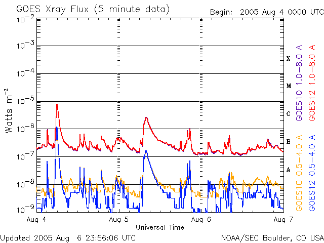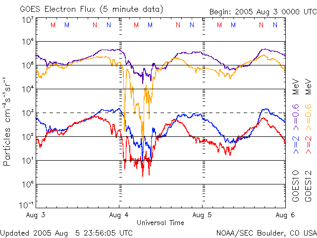 (c) SOHO (ESA & NASA) ![]() GOES衛星の太陽X線データ (c) NOAA/SEC ![]() GOES衛星による、静止衛星軌道における高エネルギー電子の変化 (c) NOAA/SEC ![]() | ||||||||||||||||||||||||||||||||||||||||||||||||||||||||