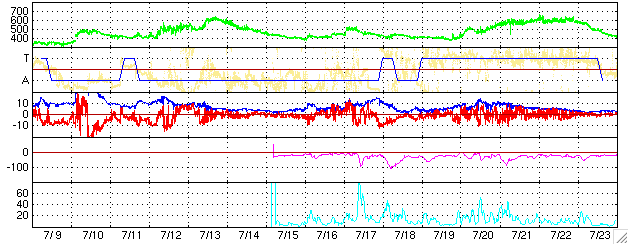 ACEが観測した太陽風の磁場(1番上の枠、白線は全体の強度、赤線は南北成分) および、太陽風の密度(3番目の橙線)、速度(4番目の黄線) (c) NOAA/SEC ![]() リアルタイムAE指数 下段のAEグラフの値が高くなると、オーロラ活動が活発化しています。 (c) 京都大学, NICT ![]() 27日の太陽周期に合わせたデータプロット (太陽風版) 太陽が同じ面を地球に向けていた27日前の変化から、今後を予想することができます。 (c) NICT
