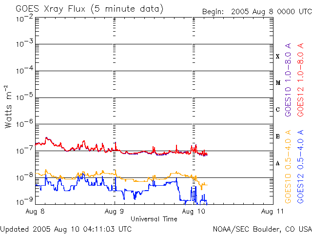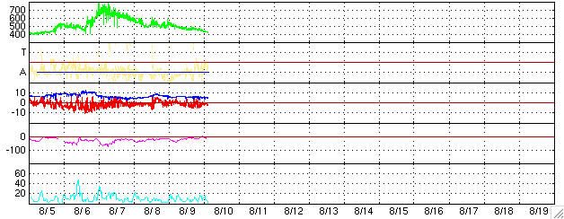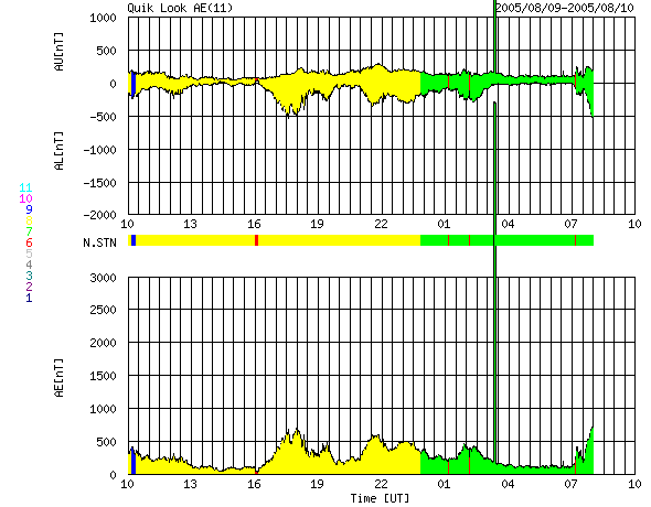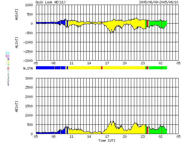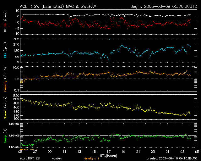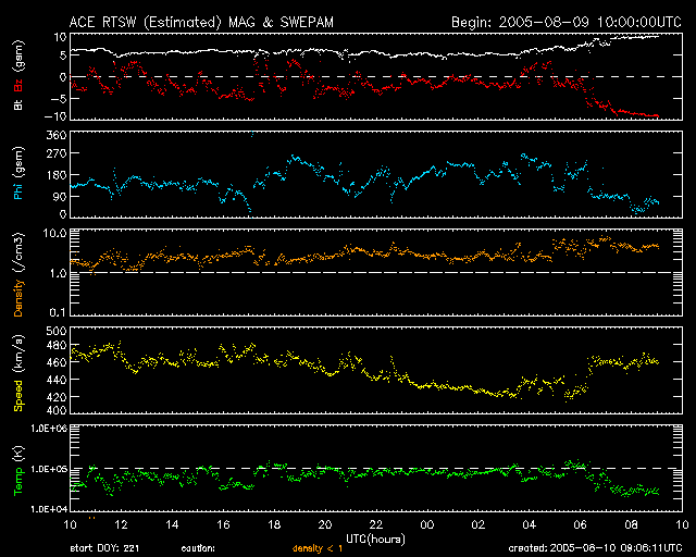 (c) NOAA/SEC ![]() GOES衛星の太陽X線データ (c) NOAA/SEC ![]() SOHO衛星のMDIカメラによる太陽黒点 (c) SOHO (ESA & NASA) ![]() 2005/ 8/10 18:06 追加 ACEが観測した太陽風の磁場(1番上の枠、白線は全体の強度、赤線は南北成分) および、太陽風の密度(3番目の橙線)、速度(4番目の黄線) (c) NOAA/SEC ![]() リアルタイムAE指数 下段のAEグラフの値が高くなると、オーロラ活動が活発化しています。 (c) 京都大学, NICT ![]() | ||||||||||||||||||||||||||||||||||||||||||||||||||||||||