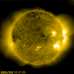 2005/ 8/10 13:12 更新 太陽風は通常の速度に下がりました(420km/秒)。オーロラ活動は小規模の活動が見られています。 2005/ 8/10 18:06 追加 太陽風磁場の南向きが強まっています(-10nT)。弱い磁気嵐が発生するかもしれません。 担当 篠原 昨日のニュース以降、太陽風は速度をゆっくりと下げ始め、現在は420km/秒まで下がっています。 通常の速度と言っていい速度です。 宇宙天気のもうひとつの大切な要素である太陽風の磁場は、 強度(ACEの図の白線)がほぼ5nTと普通の強さを保っています。 南北成分(赤線)は南向き(マイナス)の-5nT前後の変化が半日ほど続いています。 このため、オーロラ活動は小規模ですが発生しています。 AE指数のグラフでは、500nT前後の変化がたびたび観測されています。 太陽風磁場は現在も南寄りですが、南向きの強度は弱まっています。 このままであれば、オーロラ活動はもう一段穏やかになるでしょう。 太陽風の速度が下がっていることもあり、今後は穏やかな状態が続くでしょう。 放射線帯の高エネルギー電子は密度が一段下がっています。 警戒ライン(10の4乗の線)を割りそうですが、明日まで様子を見る必要があります。 太陽のフレア活動はすっかり穏やかになっています。 X線の強度はBクラスの線を割っています。 X線の動画を見ていても、ほとんど変化が無く、黒点群はどれも穏やかです。 794、795群に続く黒点群は見られず、2〜3日後にはこのまま黒点のない太陽になるかもしれません。 2005/ 8/10 18:06 追加 (篠原) 関連の図はページの最後にあります 10日15時(世界時10日6時)から、太陽風に乱れが発生しています。 速度はほんの少し速まって、460km/秒になった程度ですが、 磁場強度が10nTに強まり、大きく南を向く様になっています(ACEの赤線がマイナスになっている)。 現在、-10nTの南向きが3時間続いています。 これは、7日14時(世界時7日5時)頃に見られた、フィラメント消失の影響ではないかと思います。 太陽風のプラズマのかたまりが、強い磁場を運んでやってきた様です。 このまま太陽風磁場の南向きが続くと、磁気圏の活動が活発になり、 オーロラ活動を強めたり、弱い磁気嵐を起こす可能性があります。 AE指数のグラフにはその兆しが見えています。 速度があまり速くないため、激しい活動にはならないと思いますが、 南向き磁場が長時間続いて、磁気圏も長時間活発に活動する可能性があります。 SOHO衛星のEIT284カメラの映像 (c) SOHO (ESA & NASA)