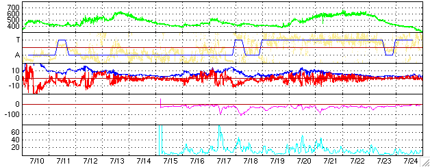 ACEが観測した太陽風の磁場(1番上の枠、白線は全体の強度、赤線は南北成分) および、太陽風の密度(3番目の橙線)、速度(4番目の黄線) (c) NOAA/SEC ![]() リアルタイムAE指数 下段のAEグラフの値が高くなると、オーロラ活動が活発化しています。 (c) 京都大学, NICT ![]() GOES衛星による、静止衛星軌道における高エネルギー電子の変化 (c) NOAA/SEC ![]() SOHO衛星のMDIカメラによる太陽黒点 (c) SOHO (ESA & NASA) ![]() GOES衛星の太陽X線データ (c) NOAA/SEC ![]() 27日の太陽周期に合わせたデータプロット (太陽風版) 太陽が同じ面を地球に向けていた27日前の変化から、今後を予想することができます。 (c) NICT
