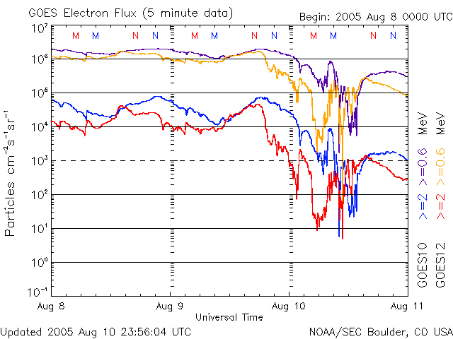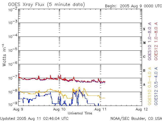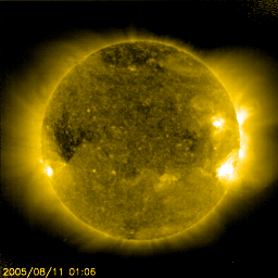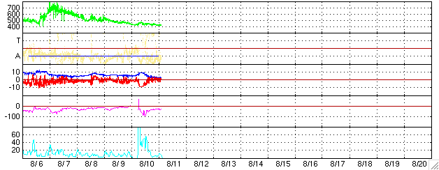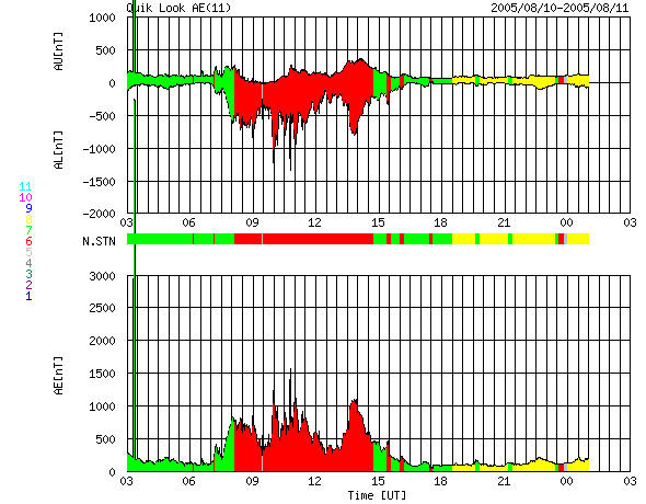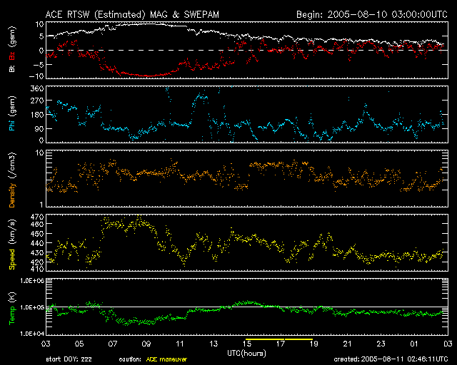 2005/ 8/11 11:48 更新 太陽風の強い南向き磁場の影響で、磁気圏が乱れました。現在は穏やかになっています。 担当 篠原 昨日、ニュースの追加でお知らせしましたが、 10日15時(世界時10日6時)頃から、太陽風の磁場が大きく南を向くという変動が発生しました。 南向きは最大で-10nTに達し、10日23時(世界時10日14時)頃まで約8時間続きました。 強い磁場を持った、太陽ガスの大きなかたまりが地球付近を通り抜けた様です。 太陽風の速度は450km/秒前後で、やや高速という程度でした。 この影響で地球の磁気圏が活動的になり、 AE指数のグラフを見ると、1000nT前後の変動が、 太陽風磁場が南を向いていた時間帯に発生していました。 ただし、磁場が大きく南を向いたために、 オーロラなどの活動域がAE観測点よりも低緯度へ下がっていて、 本当の活動度はもっと大きかった可能性もあります。 また、Dstの速報値を見ると、磁場強度が-50nT程度減少する変化が観測されており、 この期間に弱い磁気嵐状態になっていたようです。 現在の太陽風は速度が420km/秒、磁場強度3nTと、通常の状態に戻っています。 AE指数も静かになっています。 今後は、このまま穏やかな状態が続くでしょう。 SOHO EIT284の太陽写真では、太陽の中心からやや西寄り(右より)のところに、 小さなコロナホールと思われる影がかすかに見えています。 明日から明後日にかけて、多少の影響が太陽風に見られるかもしれません。 放射線帯の高エネルギー電子の密度は、今回の擾乱の影響で一気に低下しました。 現在は、警戒ラインを大きく下回っています。 太陽面では、黒点群達が西に去りつつあります。 新しい黒点群は見えておらず、このまま無黒点状態になるかもしれません。 X線の変化はほとんどなく、とても静かな太陽です。 SOHO衛星のEIT284カメラの映像 (c) SOHO (ESA & NASA)