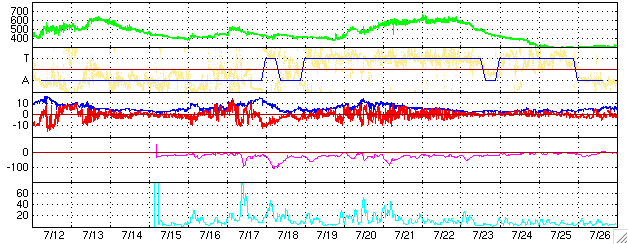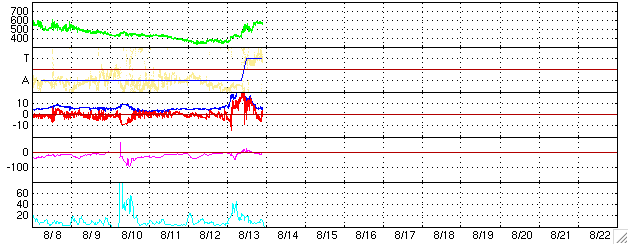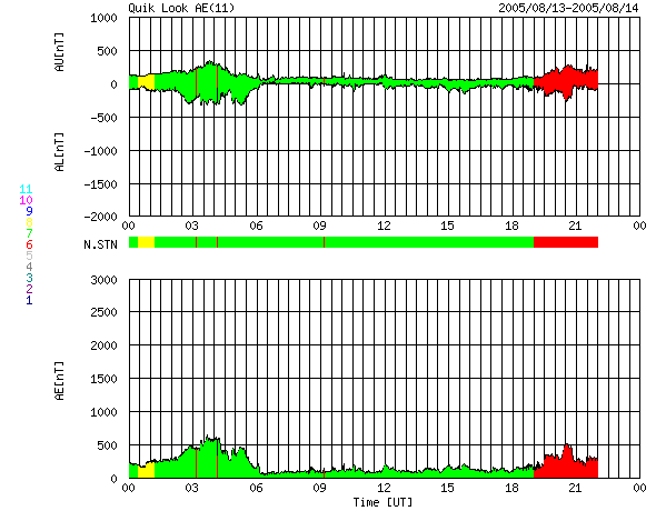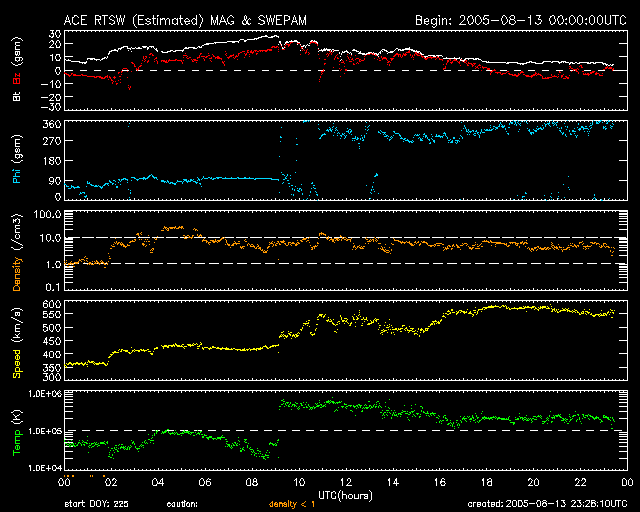 2005/ 8/14 08:29 更新 太陽風磁場が非常に強まりました(最大25nT)。しかし、北向きだったので、磁気圏はおおむね静穏です。 担当 篠原 13日11時(世界時13日2時)頃から、太陽風に乱れが発生しました。 太陽風の密度が10個/ccに急に増加しました。 それとともに、速度が350km/秒から420km/秒に増加し、 その後更に上昇して、現在は550km/秒まで上昇しています。 また、磁場強度がぐんぐん増加を始め、こちらは最大25nTにまで大きく強まりました。 磁場強度が最大に達した頃、13日19時(世界時13日10時)に太陽風磁場のセクター境界を越えています。 太陽風磁場の大まかな方向が「太陽から地球方向」から「地球から太陽方向」へ切り替わる現象です。 今回の太陽風の乱れは、このセクター境界と関係がありそうです。 セクターの切り替わりが来る事は、周期性から予想していましたが、 ここまで太陽風が大きく乱れるとは考えていませんでした。 地球の磁気圏への影響度は、太陽風磁場が南を向くかどうかで決まります(ACEの赤線がマイナスになる)。 昨日の太陽風の乱れでは、太陽風磁場の強まった時間帯には北を向いていました(赤線がプラス)。 このため、磁気圏へのエネルギーの流れ込みはほとんどなく、 AE指数のグラフにはほとんど変化が見られません。 太陽風磁場は、磁場強度が下がった後で-3nT程度南を向くようになっています。 この影響で、AE指数のグラフでも最後の部分でオーロラの活動が見えています。 これから、太陽風の速度は緩やかに低下して、次第に静穏な状態に戻っていくと思われます。 また、3日後くらいにコロナホールによる次の高速太陽風が地球にやってくるでしょう。 太陽面では797黒点群がやや成長している様ですが、小規模です。 その他に黒点群はなく、フレア活動は穏やかです。 ACEが観測した太陽風の磁場(1番上の枠、白線は全体の強度、赤線は南北成分) および、太陽風の密度(3番目の橙線)、速度(4番目の黄線) (c) NOAA/SEC ![]() リアルタイムAE指数 下段のAEグラフの値が高くなると、オーロラ活動が活発化しています。 (c) 京都大学, NICT ![]() 27日の太陽周期に合わせたデータプロット (太陽風版) 太陽が同じ面を地球に向けていた27日前の変化から、今後を予想することができます。 (c) NICT