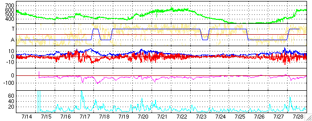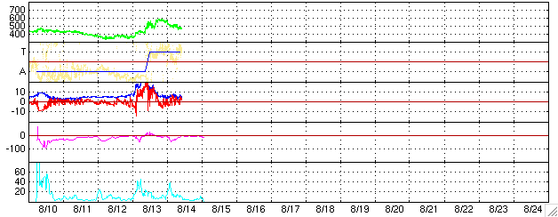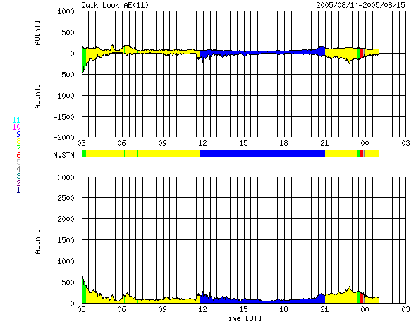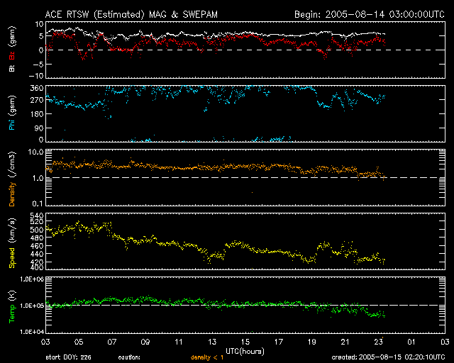 2005/ 8/15 11:22 更新 太陽風の速度は下がり、太陽風は穏やかになっています。明日以降、高速太陽風に注意が必要です。 担当 篠原 セクター境界とともに発生した太陽風の乱れは、終息しつつあります。 速度は低下を続けており、420km/秒と普通のレベルに戻りました。 磁場強度は5nTと既に普通の状態です。 おおむね北寄りに推移しており、磁気圏は静穏な状態が続いています。 AE指数のグラフには小さな変動しか観測されていません。 太陽風はこのまま明日までは穏やかな状態が続きそうです。 明日以降、コロナホールによる太陽風の乱れが発生すると予想されます。 SOHO衛星から最新の画像が届いていないのですが、 太陽の赤道付近に見えていたコロナホールから吹き出した高速の太陽風が、 明日か明後日ころに地球に届く様になります。 速度上昇とともに、太陽風磁場が南を向く様になると、 磁気嵐が発達したり、オーロラ活動が活発になります。 27日周期の図を使って、前回のこのコロナホールの影響を調べると、 世界時で7月20日から太陽風の速度の上昇が発生していました。 これは今周期の8月16日にあたります。 速度は2日ほどかけて上昇し、最大で600km/秒を越える程度まで上がりました(7月21から22日)。 この時は、オーロラも活発に発生していたようです。 今周期はどのようになるでしょうか。 太陽面では797黒点群が更に発達を続けています。 だいぶ黒点群としても立派になってきました。 しかし、フレアはほとんど起こしておらず、宇宙天気的には静穏な状態が続いています。 ACEが観測した太陽風の磁場(1番上の枠、白線は全体の強度、赤線は南北成分) および、太陽風の密度(3番目の橙線)、速度(4番目の黄線) (c) NOAA/SEC ![]() リアルタイムAE指数 下段のAEグラフの値が高くなると、オーロラ活動が活発化しています。 (c) 京都大学, NICT ![]() 27日の太陽周期に合わせたデータプロット (太陽風版) 太陽が同じ面を地球に向けていた27日前の変化から、今後を予想することができます。 (c) NICT