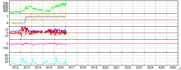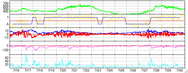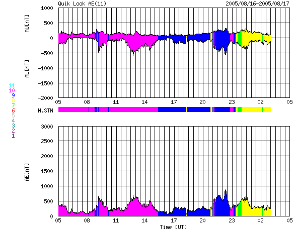 ACEが観測した太陽風の磁場(1番上の枠、白線は全体の強度、赤線は南北成分) および、太陽風の密度(3番目の橙線)、速度(4番目の黄線) (c) NOAA/SEC ![]() リアルタイムAE指数 下段のAEグラフの値が高くなると、オーロラ活動が活発化しています。 (c) 京都大学, NICT ![]() 27日の太陽周期に合わせたデータプロット (太陽風版) 太陽が同じ面を地球に向けていた27日前の変化から、今後を予想することができます。 (c) NICT