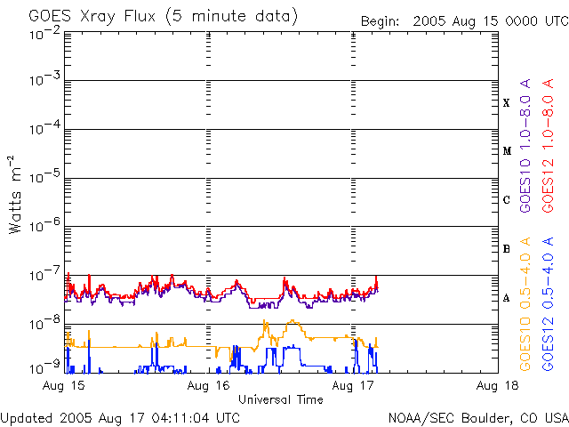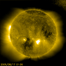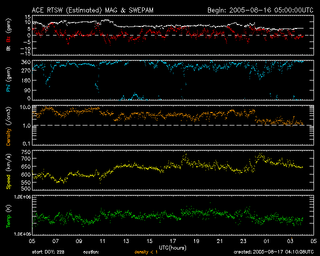 2005/ 8/17 13:12 更新 高速の太陽風が続いています(650km/秒)。磁気圏はやや活発になっています。 担当 篠原 コロナホールによる高速の太陽風が続いています。 速度は650km/秒を中心に、600km/秒から700km/秒の間を変動しています。 コロナホールの影響域のまっただ中にある様です。 太陽風磁場は10nTに強まっていましたが、現在は5nTに弱まっています。 南北成分は北寄りが中心ですが、細かく変動して南向きになる時間も見られています。 このため、磁気圏のオーロラ活動はやや活発という程度にとどまっています。 AE指数のグラフでは、500〜700nT程度の小規模の活動がたびたび見られていますが、 激しい変化には至っていません。 高速風はもう2〜3日続きそうです。 磁場強度の強まりが終わったので、これ以上高速になることはないでしょう。 また、磁場強度が弱まったことからオーロラ活動も激しくはなりにくくなっています。 その後は、太陽風は穏やかになるでしょう。 SOHO EIT284の太陽写真には、中心から下よりにコロナホールが見えています。 しかし、コロナホールの位置が赤道から離れているので、 吹き出している高速の太陽風は地球へは届きにくくなっています。 前周期の場合は、ほとんど影響は見られませんでした。 太陽のフレア活動は現在もとても穏やかです。 797群は規模はほとんど変わっていません。 ただし、Cクラスの小規模フレアを起こす可能性があるそうです。 SOHO衛星のEIT284カメラの映像 (c) SOHO (ESA & NASA)
