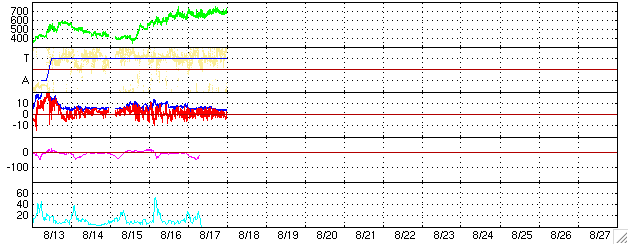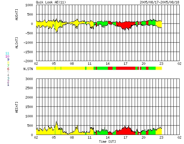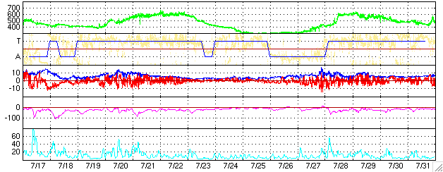 ACEが観測した太陽風の磁場(1番上の枠、白線は全体の強度、赤線は南北成分) および、太陽風の密度(3番目の橙線)、速度(4番目の黄線) (c) NOAA/SEC ![]() リアルタイムAE指数 下段のAEグラフの値が高くなると、オーロラ活動が活発化しています。 (c) 京都大学, NICT ![]() 27日の太陽周期に合わせたデータプロット (太陽風版) 太陽が同じ面を地球に向けていた27日前の変化から、今後を予想することができます。 (c) NICT